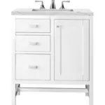 The Addison 30″ Single Vanity Cabinet by James Martin Vanities gives you a fresh take on Shaker-inspired design with a look of luxury. Handcrafted and gender-neutral, it fits effortlessly into modern or transitional rooms. The Shaker styling comes from the cabinet’s distinct sides, drawers, and door. Premium standard features include soft-close, full extension under-mount drawer glides and adjustable door hinges, brushed aluminum laminate drawer bottoms, one 120 Volt UL-rated electrical component with two electrical and two USB outlets, and one bamboo drawer organizer. The body of the cabinet is made of solid hardwood and sturdy panels of MDF. The look is completed with a 3 cm eased edge Silestone Eternal Marfil quartz top and one white ceramic rectangular sink.