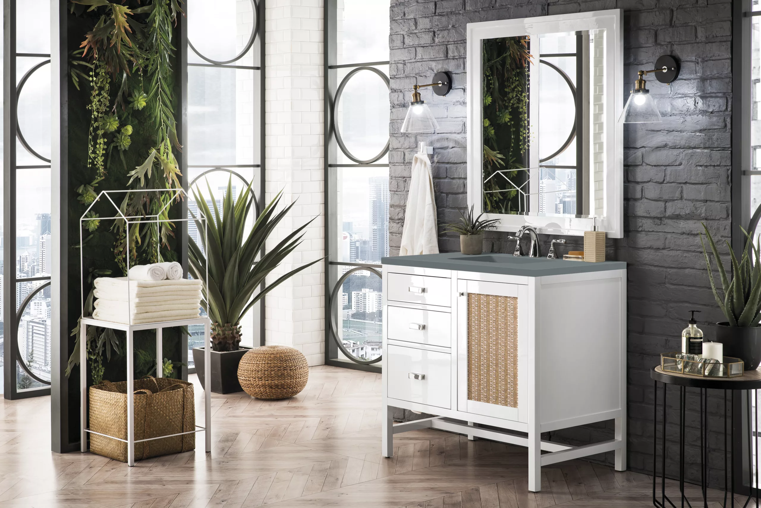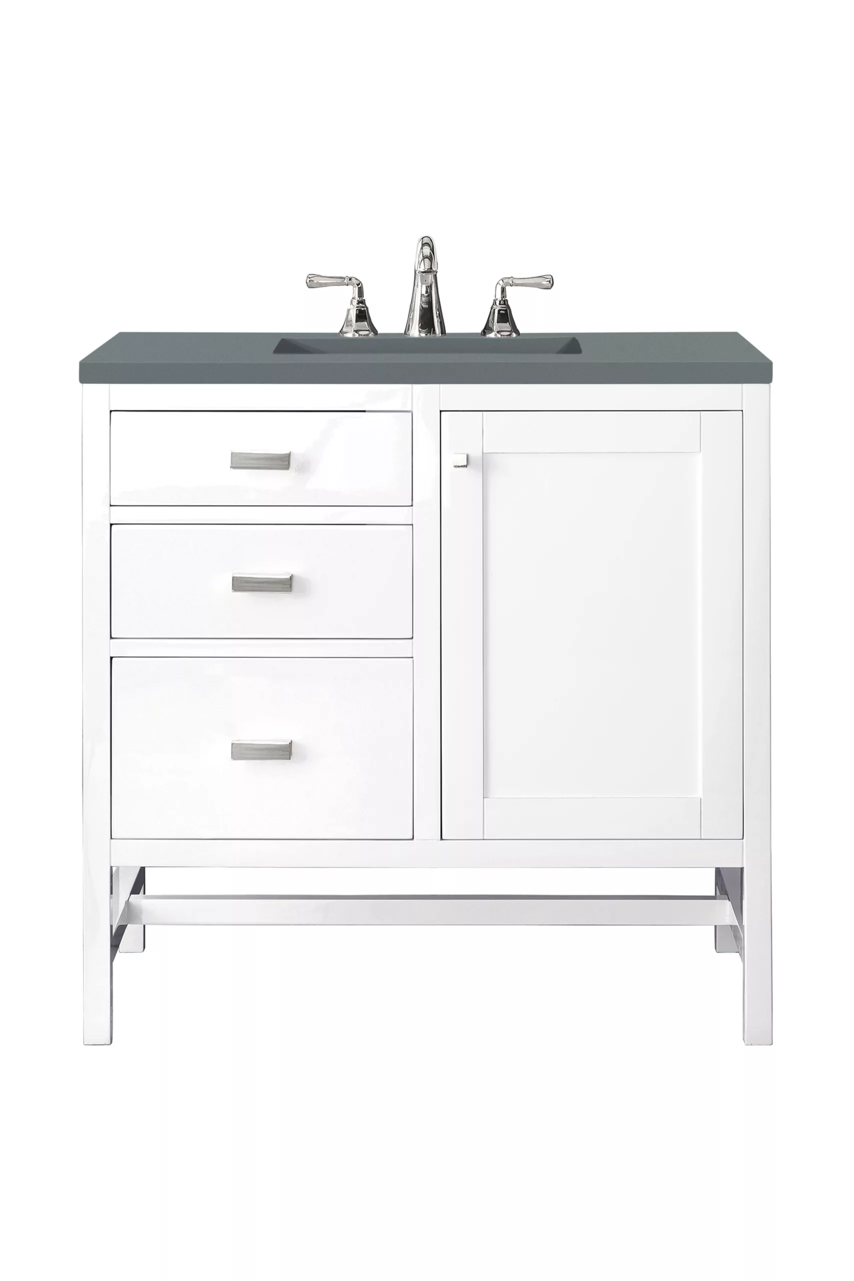 The Addison 36″ Glossy White Single Vanity by James Martin Vanities gives you you a fresh take on Shaker-inspired design with a look of luxury. Handcrafted and gender-neutral, it fits effortlessly into modern or transitional rooms. The Shaker touch comes from the cabinet’s distinct sides, drawers, and door. Premium standard features include soft-close undermount drawer glides and adjustable door hinges, brushed aluminium laminate drawer bottoms, one 120 Volt UL rated electrical component with two electrical and two USB outlets, and one bamboo drawer organizer. The body of the cabinet is made of solid hardwood and sturdy panels of MDF. The look is completed with a 3 CM eased edge Cala Blue Silestone Quartz top and one white ceramic rectangular sink.
