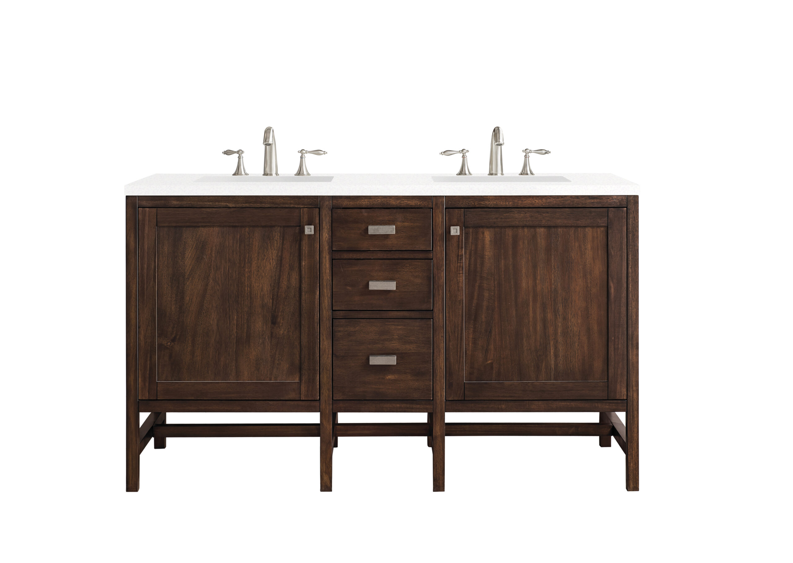 The Addison 60″ Mid-Century Acacia Double Vanity by James Martin Vanities gives you you a fresh take on Shaker-inspired design with a look of luxury. Handcrafted and gender-neutral, it fits effortlessly into modern or transitional rooms. The Shaker touch comes from the cabinet’s distinct sides, drawers, and doors. Premium standard features include soft-close undermount drawer glides and adjustable door hinges, brushed aluminium laminate drawer bottoms, one 120 Volt UL rated electrical component with two electrical and two USB outlets, and one bamboo drawer organizer. The body of the cabinet is made of solid hardwood and sturdy panels of MDF. The look is completed with a 3 CM eased edge White Zeus Silestone top and two white ceramic rectangular sinks.
