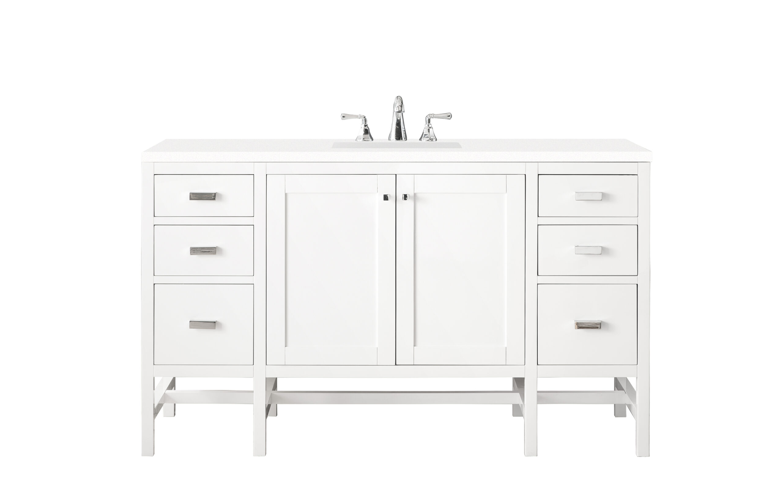 The Addison 60″ Glossy White Single Vanity by James Martin Vanities gives you you a fresh take on Shaker-inspired design with a look of luxury. Handcrafted and gender-neutral, it fits effortlessly into modern or transitional rooms. The Shaker touch comes from the cabinet’s distinct sides, drawers, and doors. Premium standard features include soft-close undermount drawer glides and adjustable door hinges, brushed aluminium laminate drawer bottoms, one 120 Volt UL rated electrical component with two electrical and two USB outlets, and one bamboo drawer organizer. The body of the cabinet is made of solid hardwood and sturdy panels of MDF. The look is completed with a 3 CM eased edge White Zeus Silestone top and one white ceramic rectangular sink.
