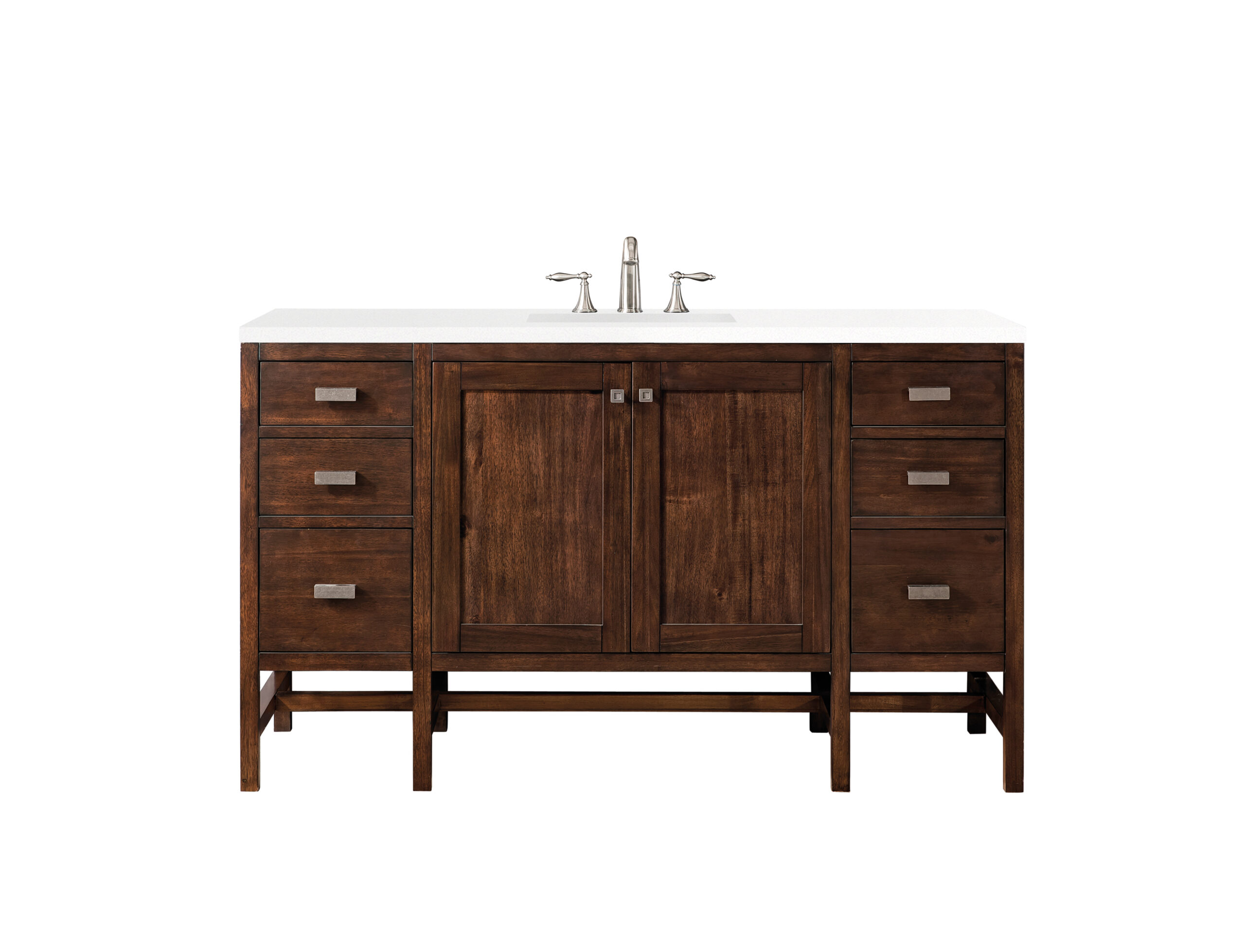 The Addison 60″ Mid-Century Acacia Single Vanity by James Martin Vanities gives you you a fresh take on Shaker-inspired design with a look of luxury. Handcrafted and gender-neutral, it fits effortlessly into modern or transitional rooms. The Shaker touch comes from the cabinet’s distinct sides, drawers, and doors. Premium standard features include soft-close undermount drawer glides and adjustable door hinges, brushed aluminium laminate drawer bottoms, one 120 Volt UL rated electrical component with two electrical and two USB outlets, and one bamboo drawer organizer. The body of the cabinet is made of solid hardwood and sturdy panels of MDF. The look is completed with a 3 CM eased edge White Zeus Silestone top and one white ceramic rectangular sink.