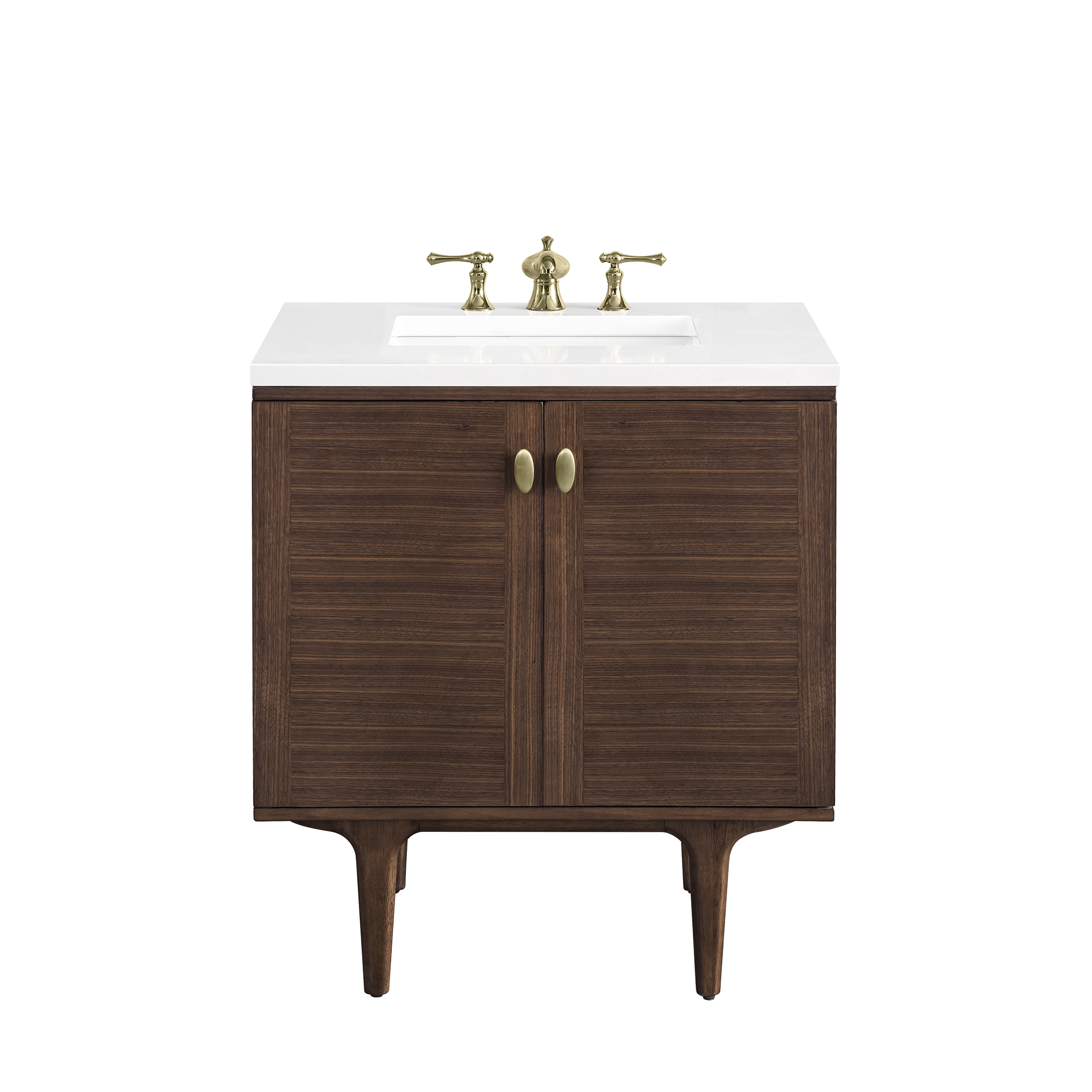 The 30″ Amberly Single Vanity celebrates Mid-Century simplistic forms and finish details combined with practical function. The beauty of the natural grains in the walnut veneer steals the show, while the decorative, oval knobs in Champagne Brass provide the perfect accent. This two-door cabinet opens to a spacious interior with a single shelf and a convenient USB/Electric power outlet. The elegant wood base elevates the Vanity Cabinet in a true console style, though you may choose the more modern, space-saving wall-mount option. The 3 cm, eased-edge White Zeus Silestone top completes the look.