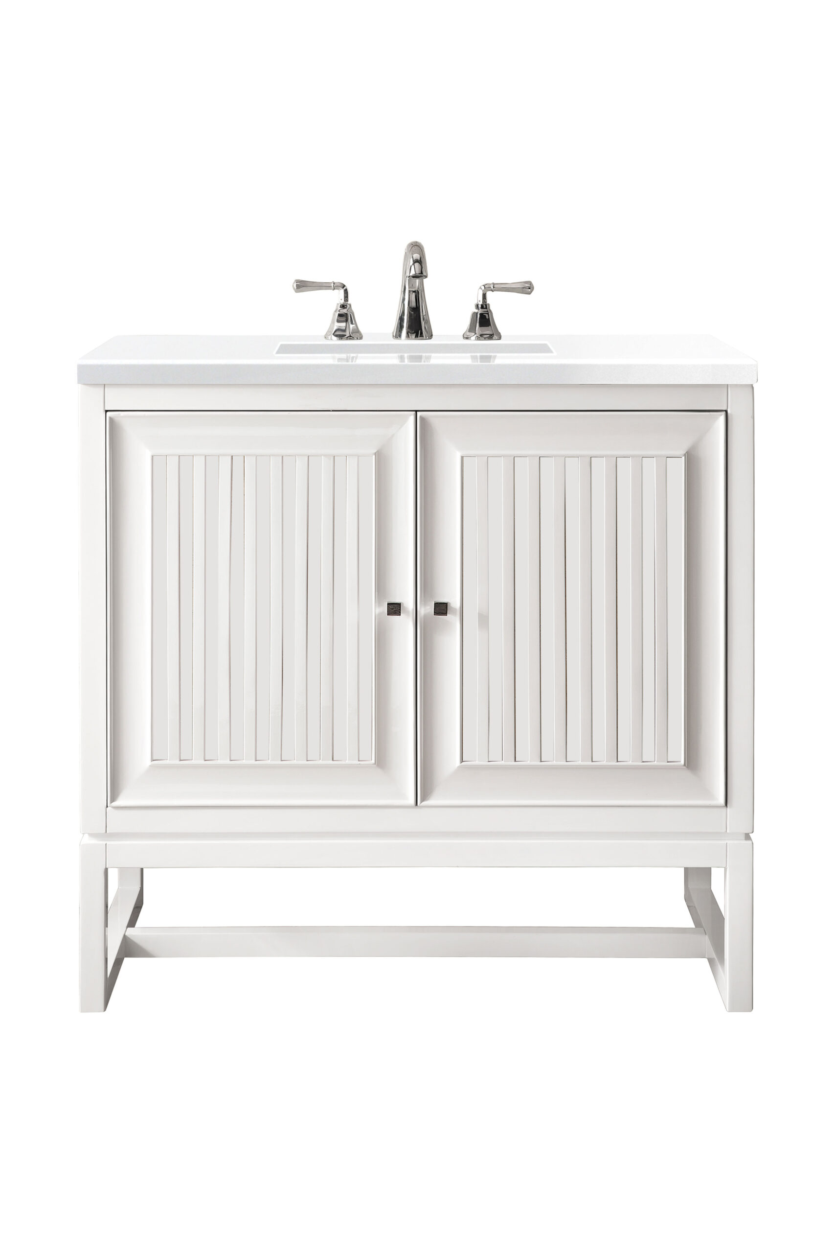 Bring a bit of the Greek Island home with the Athens 30” Glossy White Single Vanity by James Martin Vanities. Part of the larger Athens modular collection, this incredible Vanity boasts an impressive amount of storage space and combines traditional charm with modern functionality. Premium standard features include soft-close undermount drawer glides and adjustable door hinges, a brushed aluminium laminate drawer bottom, and one bamboo drawer organizer. The look is completed with a 3 CM eased edge White Zeus Silestone top and one white ceramic rectangular sink.