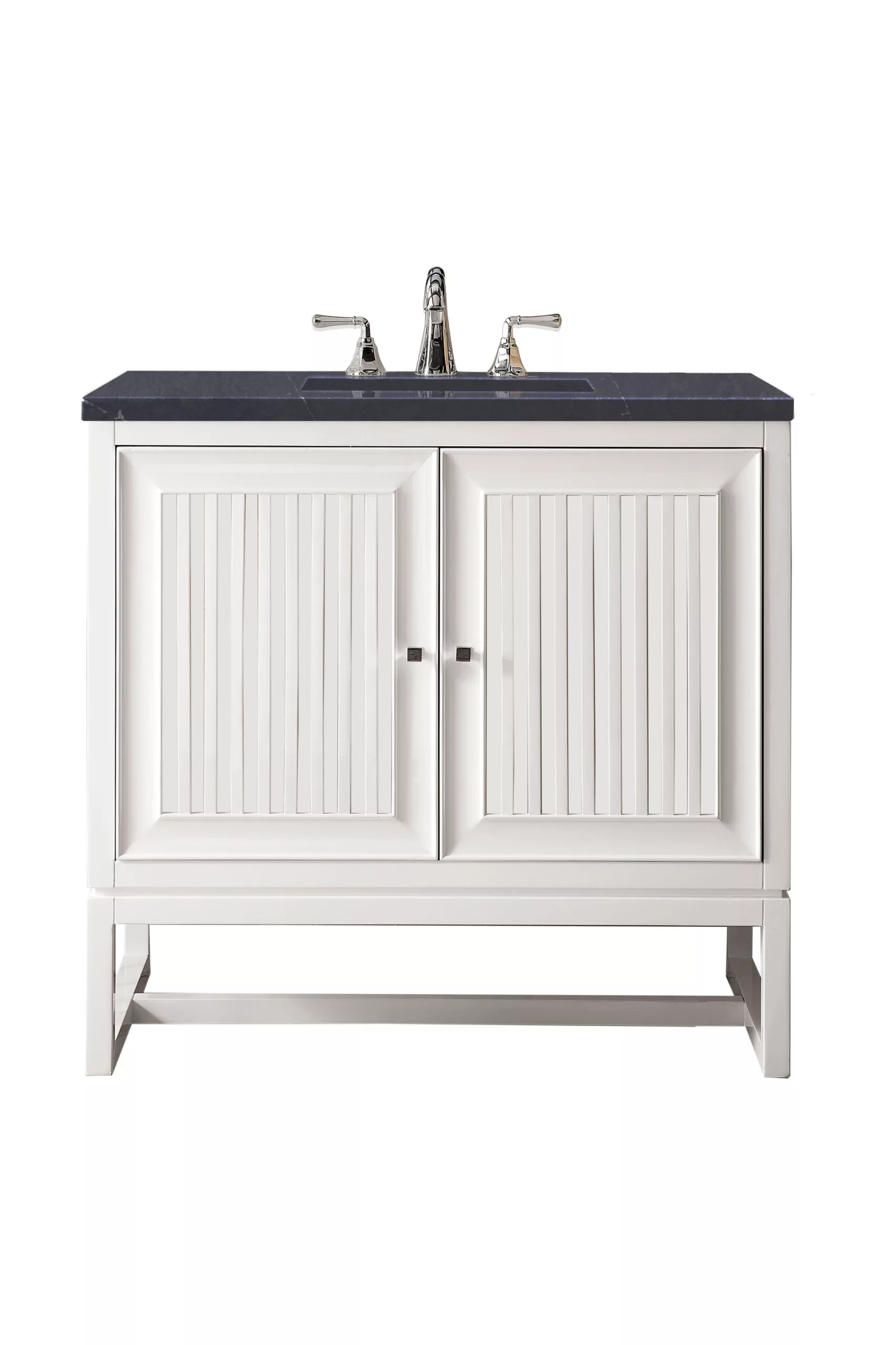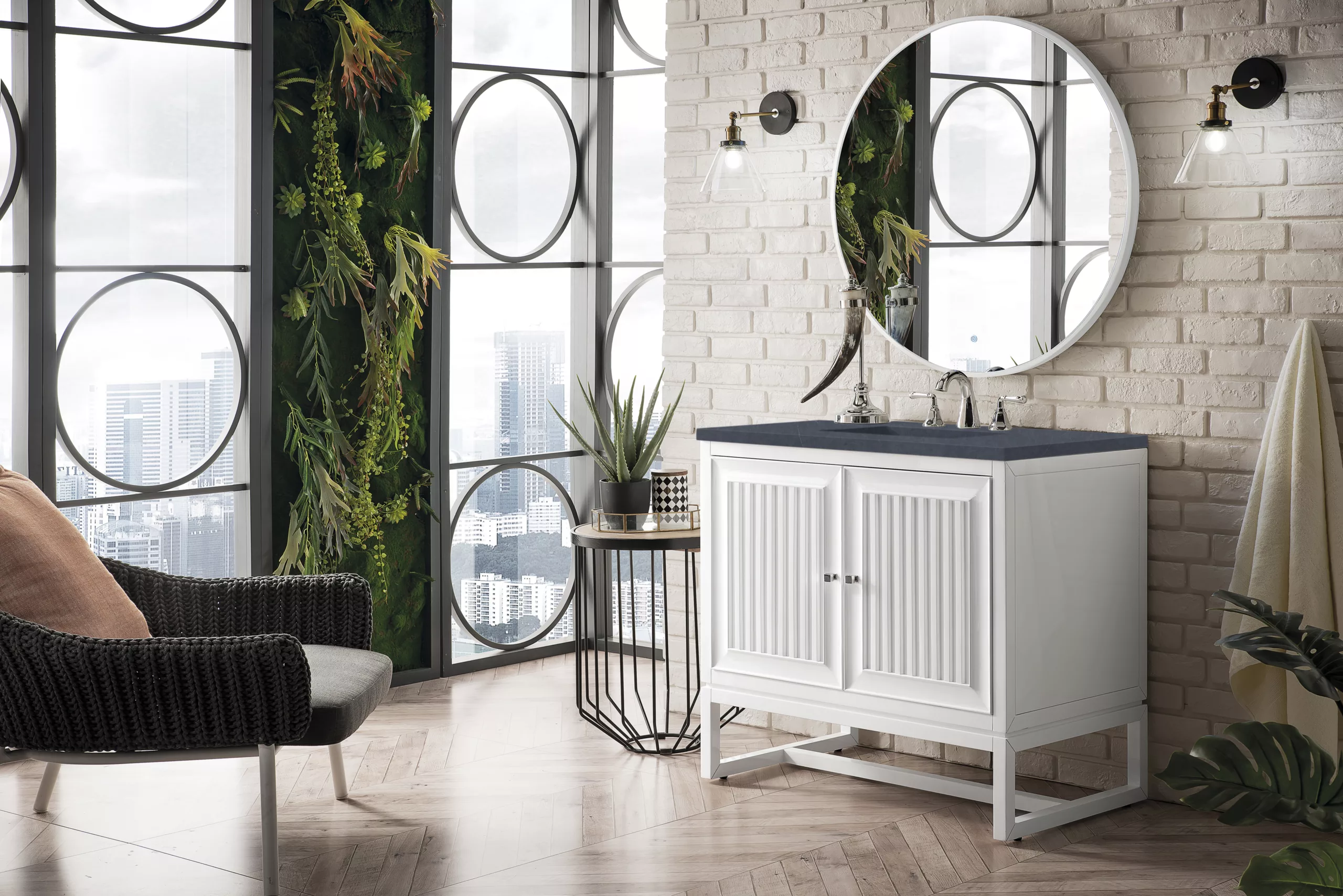 Bring a bit of the Greek Island home with the Athens 36” Glossy White Single Vanity by James Martin Vanities. Part of the larger Athens modular collection, this incredible Vanity boasts an impressive amount of storage space and combines traditional charm with modern functionality. Premium standard features include soft-close undermount drawer glides and adjustable door hinges, brushed aluminium laminate drawer bottoms, and one bamboo drawer organizer. The look is completed with a 3 CM eased edge Charcoal Soapstone Silestone Quartz top and one white ceramic rectangular sink.