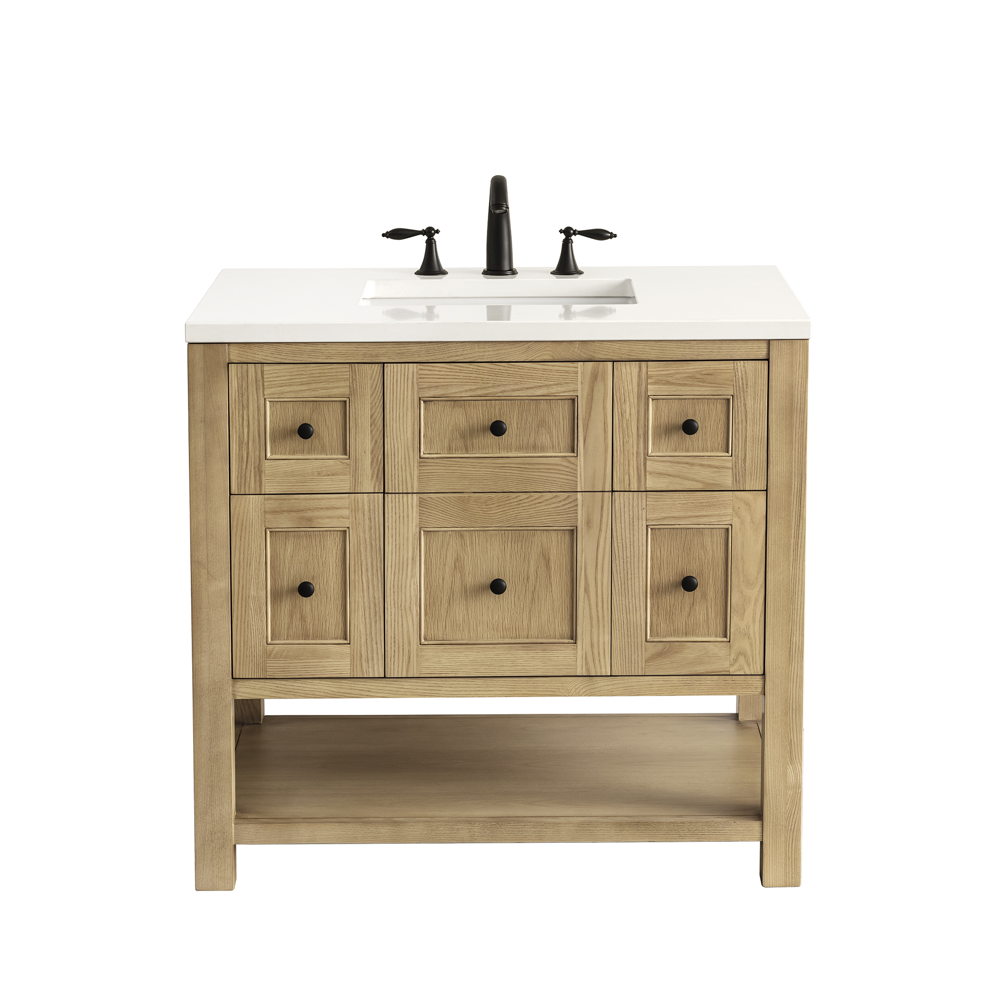 The Breckenridge 36″ Single Vanity is a fresh take on traditional Mission furniture that easily transitions to Modern Farmhouse style with an air of understated sophistication. Matte Black knobs complement the Light Natural Oak finish, while the neatly inset door and drawer fronts lend a fresh appeal to this clean-lined classic. A single-door cabinet opens to reveal an interior shelf equipped with convenient built-in USB/120V power outlet. This console-style vanity also features two top-row tip-out drawers, two standard full-extension drawers, and an open lower shelf for additional storage. A classic White Zeus Silestone top with undermount sink completes the look.