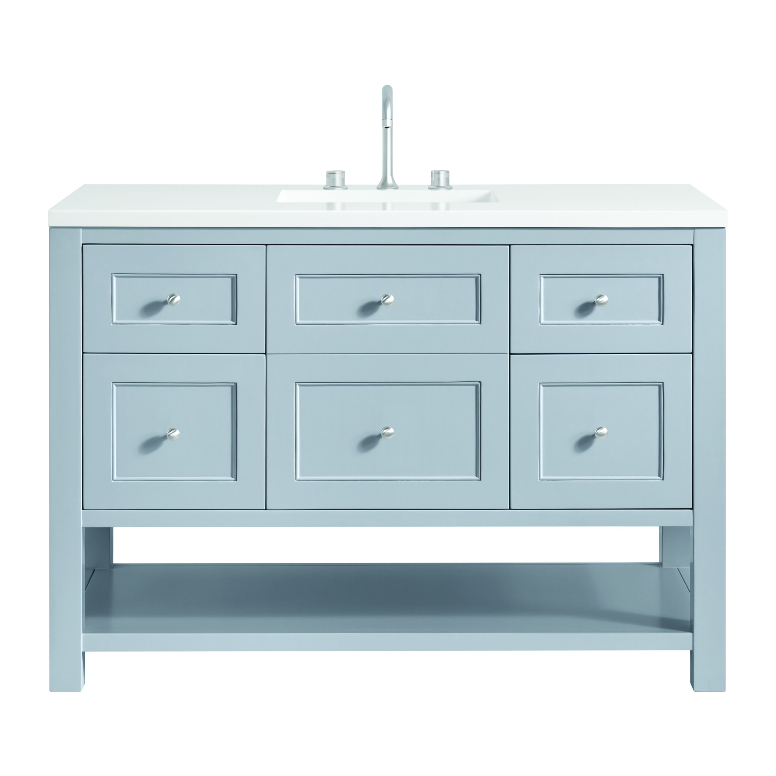 The Breckenridge 48″ Single Vanity is a fresh take on traditional Mission furniture that easily transitions to Modern Farmhouse style with an air of understated sophistication. Satin Nickel knobs complement the Serenity Blue finish, while the neatly inset door and drawer fronts lend a fresh appeal to this clean-lined classic. A single-door cabinet opens to reveal an interior shelf equipped with convenient built-in USB/120V power outlet. This console-style vanity also features four full-extension drawers and an open lower shelf for additional storage. A classic White Zeus Silestone top with undermount sink completes the look.