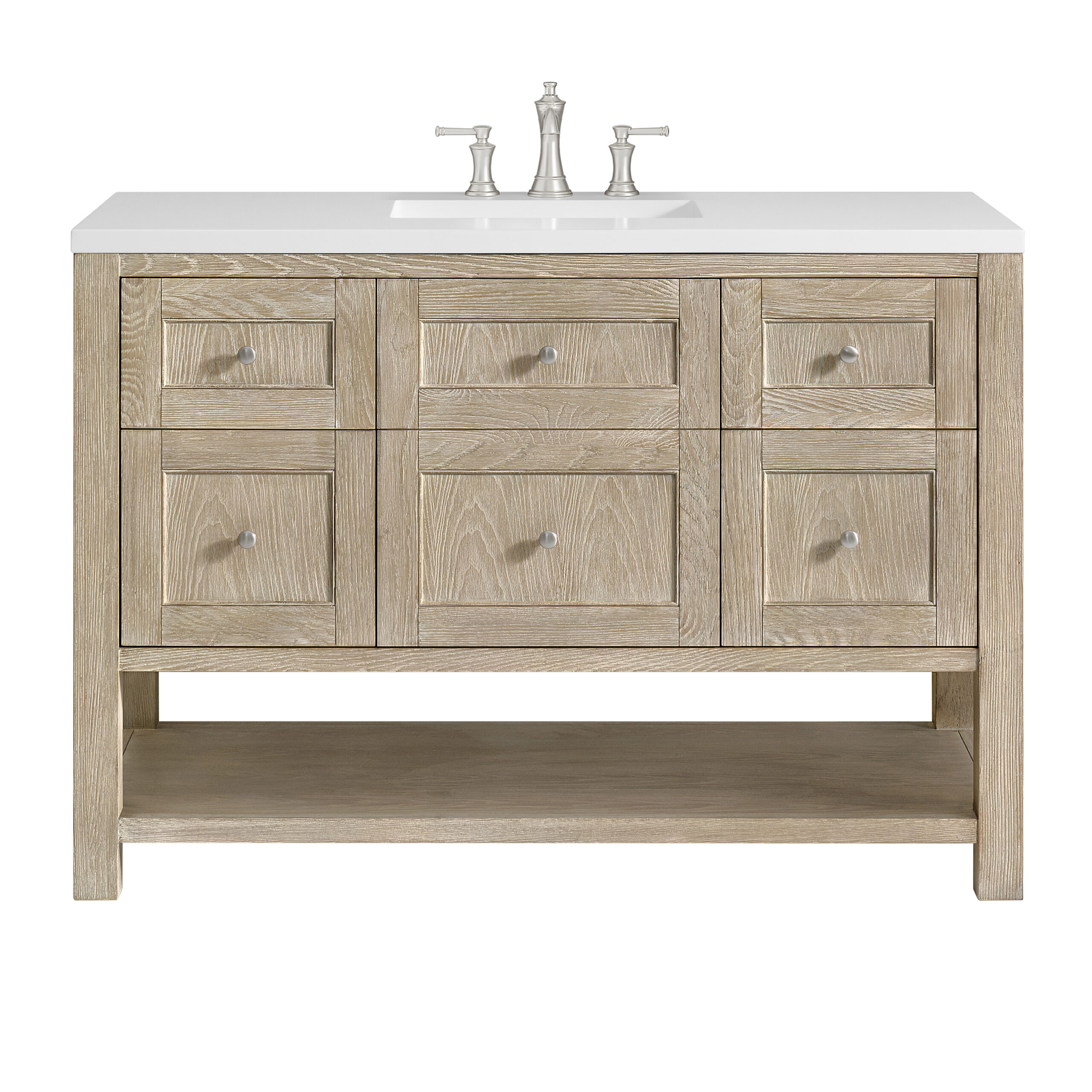 The Breckenridge 48″ Single Vanity is a fresh take on traditional Mission furniture that easily transitions to Modern Farmhouse style with an air of understated sophistication. Satin Nickel knobs complement the Whitewashed Oak finish, while the neatly inset door and drawer fronts lend a fresh appeal to this clean-lined classic. A single-door cabinet opens to reveal an interior shelf equipped with convenient built-in USB/120V power outlet. This console-style vanity also features four full-extension drawers and an open lower shelf for additional storage. A classic White Zeus Silestone top with undermount sink completes the look.