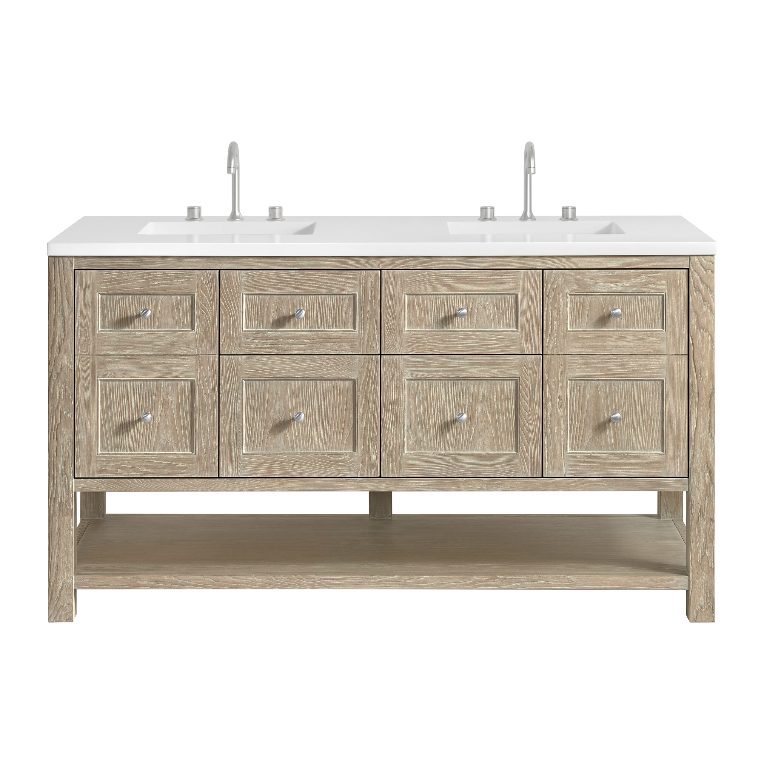 The Breckenridge 60″ Double Vanity is a fresh take on traditional Mission furniture that easily transitions to Modern Farmhouse style with an air of understated sophistication. Satin Nickel knobs complement the Whitewashed Oak finish, while the neatly inset door and drawer fronts lend a fresh appeal to this clean-lined classic. Two single-door cabinets open to reveal interior shelves equipped with a convenient built-in USB/120V power outlet. This console-style vanity also features two top-row tip-out drawers, two standard full-extension drawers, and an open lower shelf for additional storage. A classic White Zeus Silestone top with undermount sinks completes the look.