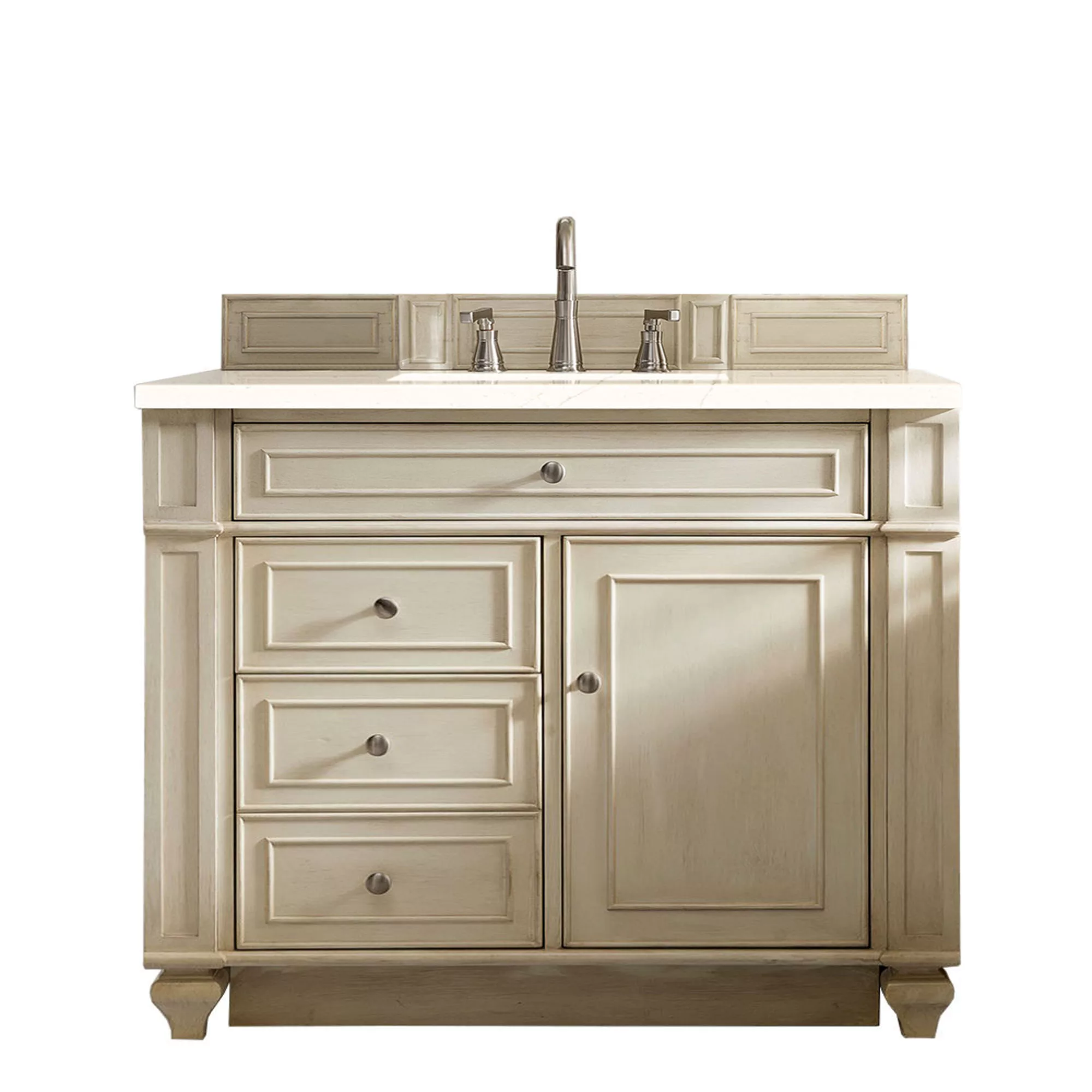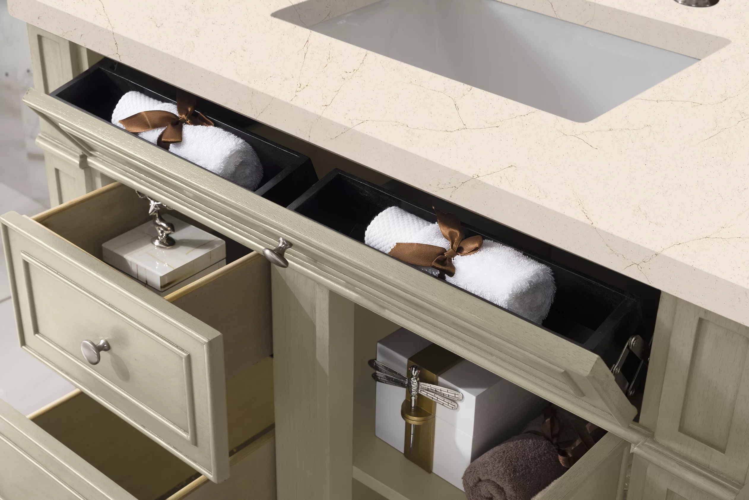 The Bristol 36″ Vintage Vanilla Single Vanity features a full plinth base, also known as a toe kick or pedestal base. This wraparound base allows for quick clean ups. This vanity is complimented by Satin Nickel door and drawer pulls, along with an optional wood backsplash. The look is completed with a 3 CM eased edge Eternal Marfil Silestone Quartz top and one white ceramic rectangular sink.