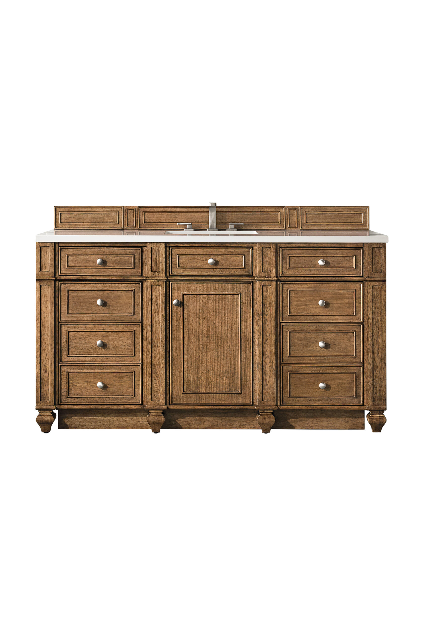 The Bristol 60″ Saddle Brown Single Vanity features a full plinth base, also known as a toe kick or pedestal base. This wraparound base allows for quick clean ups. This vanity is complimented by Satin Nickel door and drawer pulls, along with an optional wood backsplash. The look is completed with a 3 CM eased edge White Zeus Silestone top and one white ceramic rectangular sink.