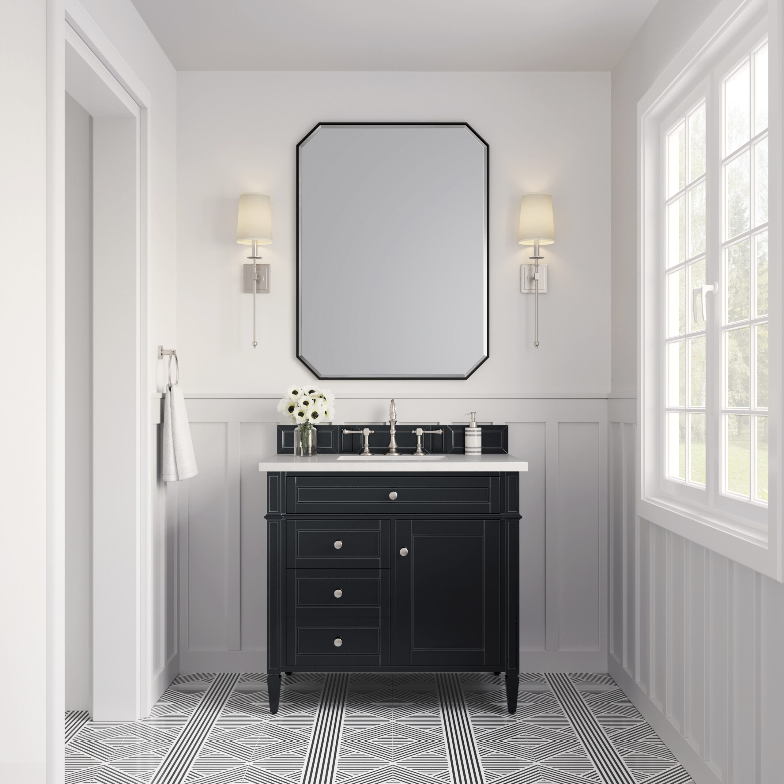 The Brittany 36″ Black Onyx Single Vanity by James Martin Vanities features classic details that bridge both traditional and transitional styles. This beautiful piece of furniture includes one hide-away tip-out, top row drawer plus two full-depth side drawers, one of which is double-height for storage of taller items. This cabinet also has one door, which conceals an interior shelf for ample storage. Handcrafted in yellow poplar solids and veneers with satin nickel hardware. Matching wood backsplash is included. The look is completed with a 3 CM eased edge White Zeus Silestone top by Cosentino and one white ceramic sink.