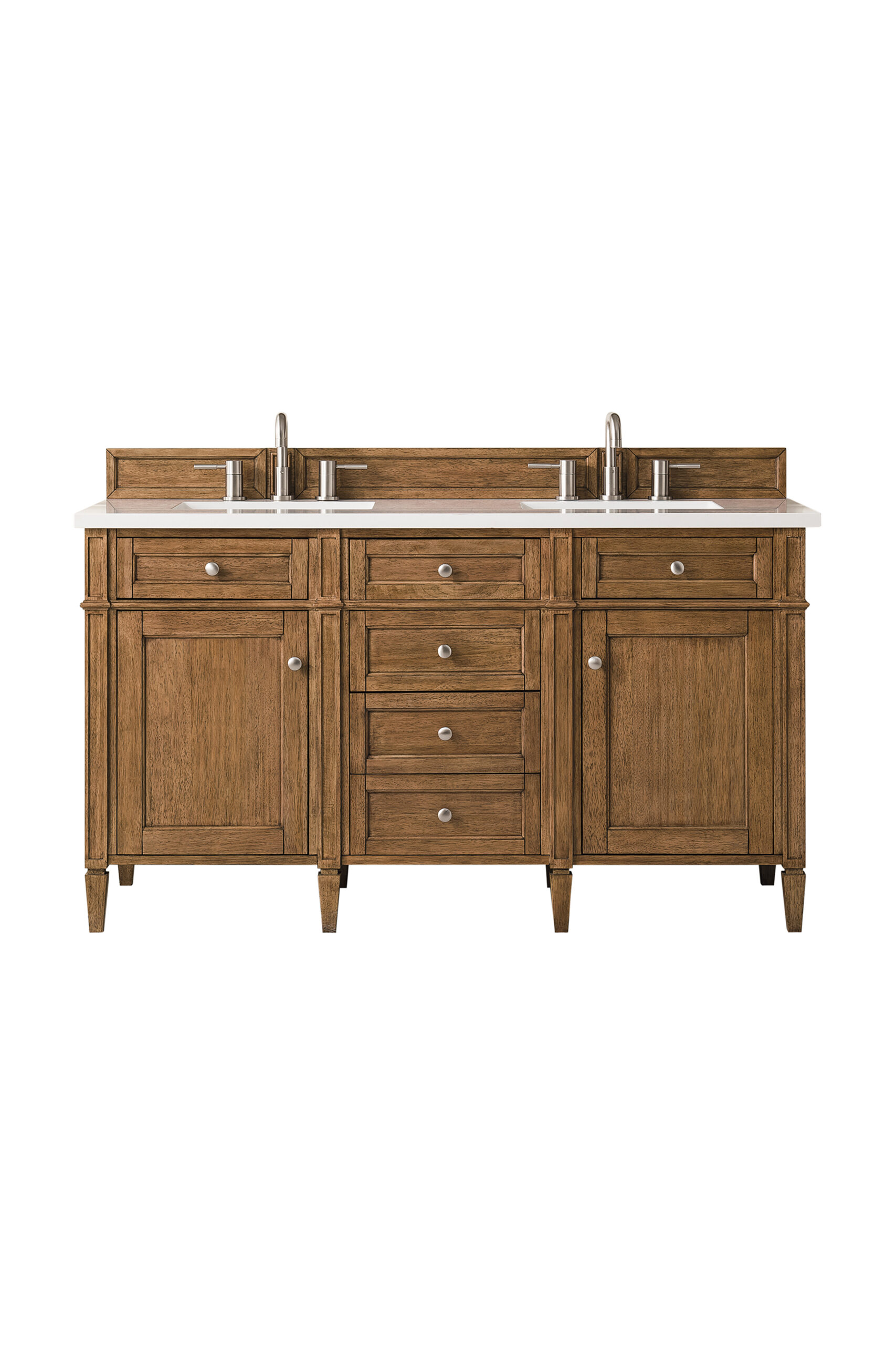 The Brittany 60″ Saddle Brown Double Vanity by James Martin Vanities features classic details that bridge both traditional and transitional styles. This beautiful piece of furniture includes two hide-away tip-out, top row drawers and four full-depth drawers. This cabinet also has two doors, which conceal an interior shelf for ample storage. Handcrafted in yellow poplar solids and veneers with satin nickel hardware. Matching wood backsplash is included. The look is completed with a 3 CM eased edge 3 CM eased edge White Zeus Silestone top with two white ceramic rectangular sinks.