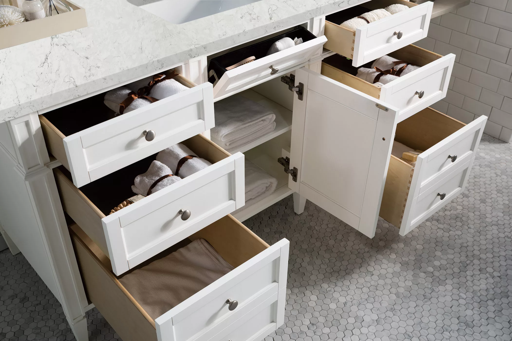The Brittany 60″ Bright White Single Vanity by James Martin Vanities features classic details that bridge both traditional and transitional styles. This beautiful piece of furniture includes one hide-away top row tip-out drawer, plus six full-depth drawers, two of which are double-height for storage of taller items. This cabinet also has one door, which conceals an interior shelf for ample storage. Hand crafted in yellow poplar solids and yellow poplar veneers with Satin Nickel hardware. Matching wood backsplash is included. The look is completed with a 3 CM eased edge Eternal Jasmine Pearl Silestone Quartz top by Silestone and one white ceramic sink.