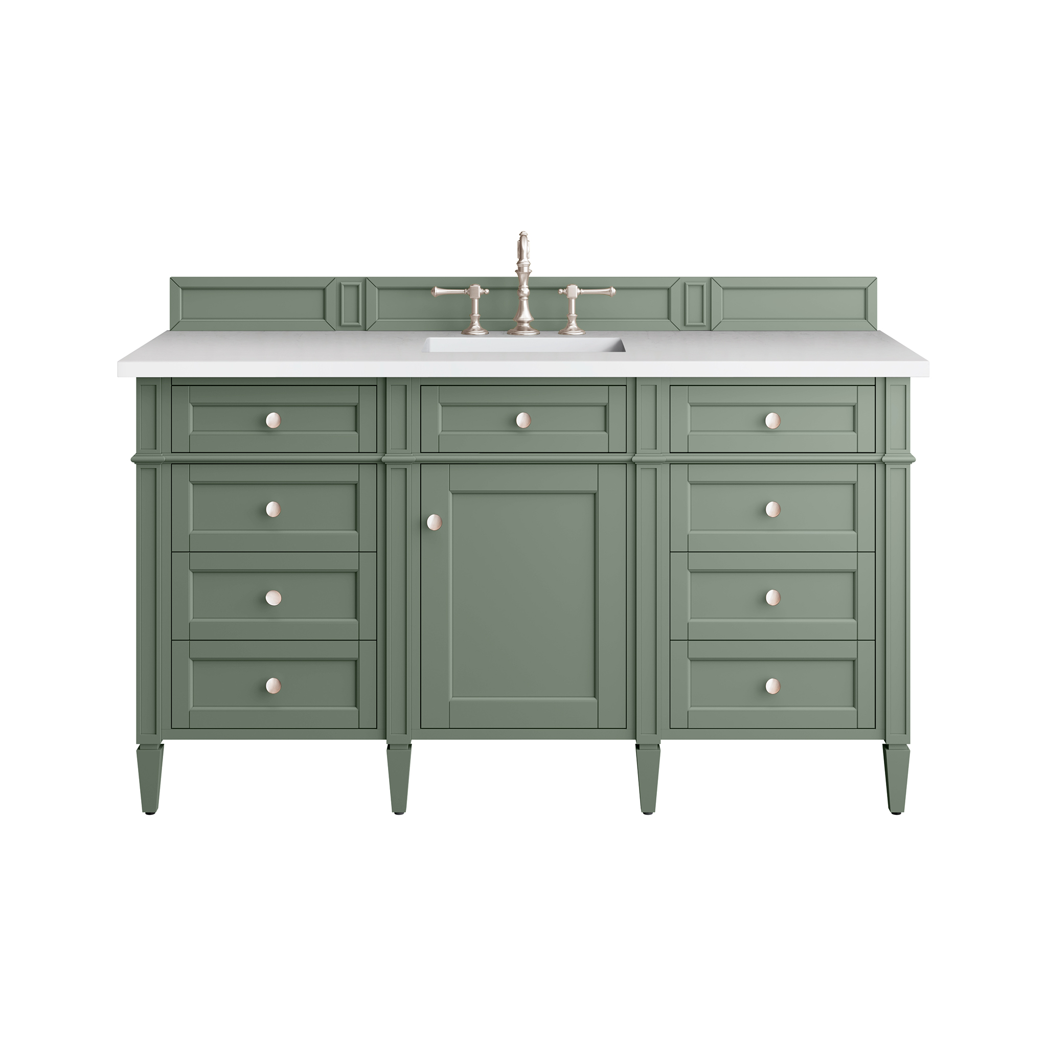 The Smokey Celadon finish on the 60″ Brittany Vanity adds a refreshing, natural element to any bathroom space. This moody, yet muted green, with subtle blue and grey undertones, brings the rich, timeless details of the Brittany collection to life. The 60″ cabinet, with decorative wood backsplash, features optimal organization with one hide-away tip-out drawer plus six side drawers, two of which are double height for storing taller items. This cabinet also has one door, which conceals an interior shelf. All drawers are lined with an aluminum laminate surface for easy cleaning and are equipped with undermount soft-close slides. The bright, crisp White Zeus 3 CM Silestone top adds a beautiful finishing touch. All of our 3 CM tops include a porcelain undermount sink.