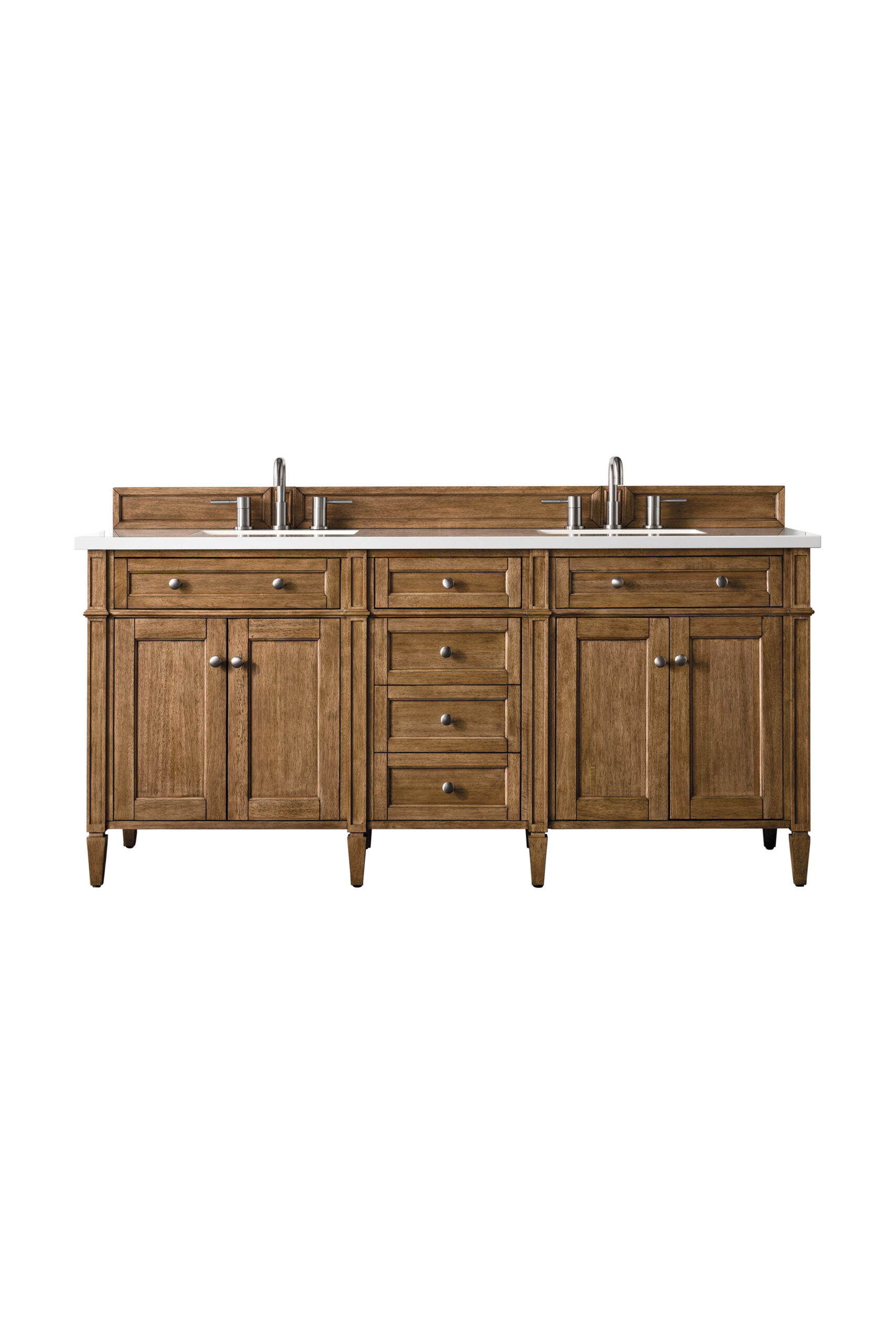 The Brittany 72″ Saddle Brown Double Vanity by James Martin Vanities features classic details that bridge both traditional and transitional styles. This beautiful piece of furniture includes two hide-away tip-out, top row drawers and four full-depth drawers. This cabinet also has four doors which conceal interior shelves for ample storage. Handcrafted in yellow poplar solids and veneers with satin nickel hardware. Matching wood backsplash is included. The look is completed with a 3 CM eased edge 3 CM eased edge White Zeus Silestone top with two white ceramic rectangular sinks.