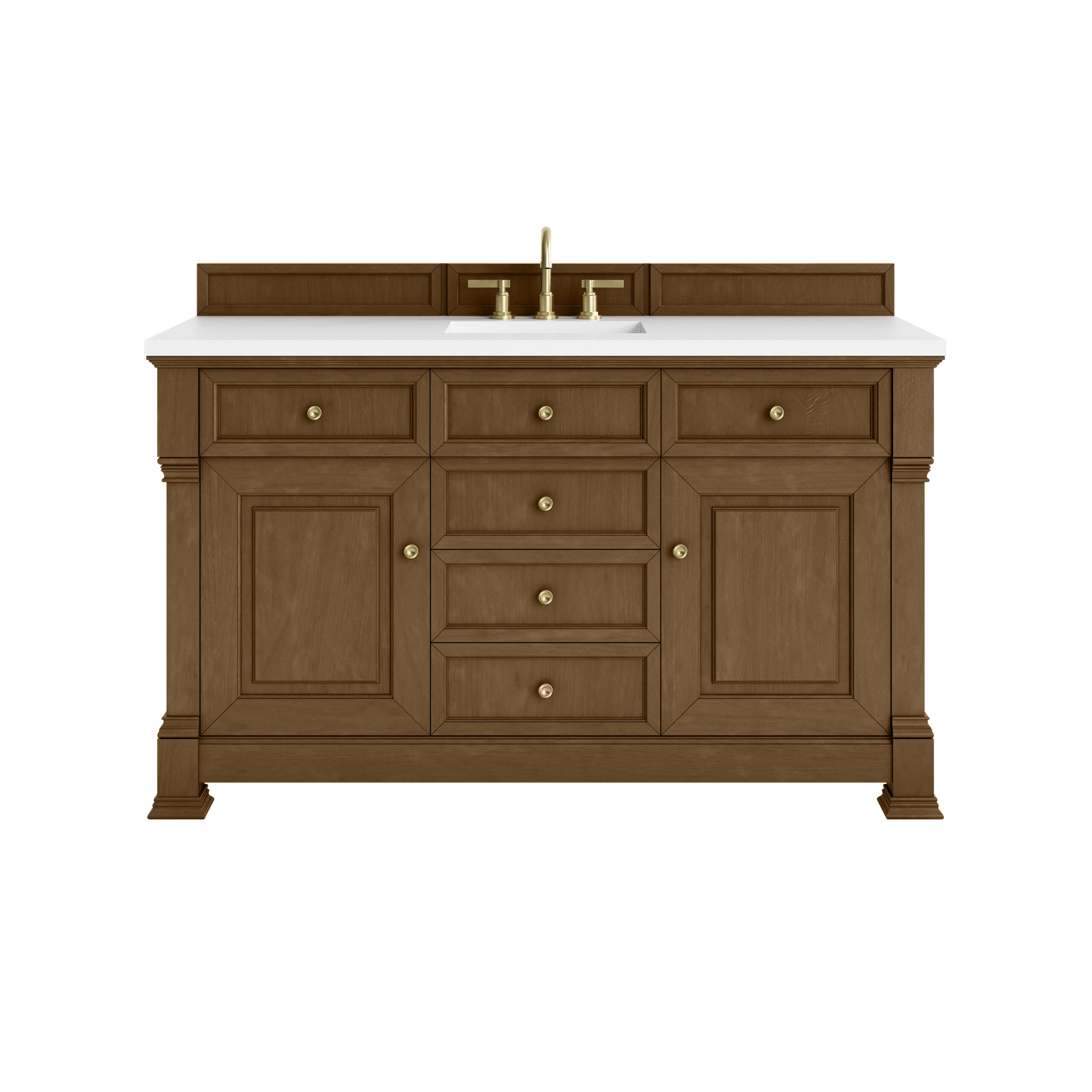 The Brookfield 60″ Single Vanity in Honey Oak by James Martin Vanities offers a blend of traditional elegance and contemporary sophistication. The raised panel picture frame doors and detailed corner molding reflect timeless craftsmanship, while the warm Honey Oak finish and Champagne Brass hardware lend a fresh, modern appeal. This beautifully crafted vanity features two single door cabinets that open to interior shelves, along with five standard drawers for ample storage. The warm wood tones highlight the natural Oak wood grains, lending sophistication and charm to your space. A classic White Zeus Silestone® top with undermount sink completes the look.