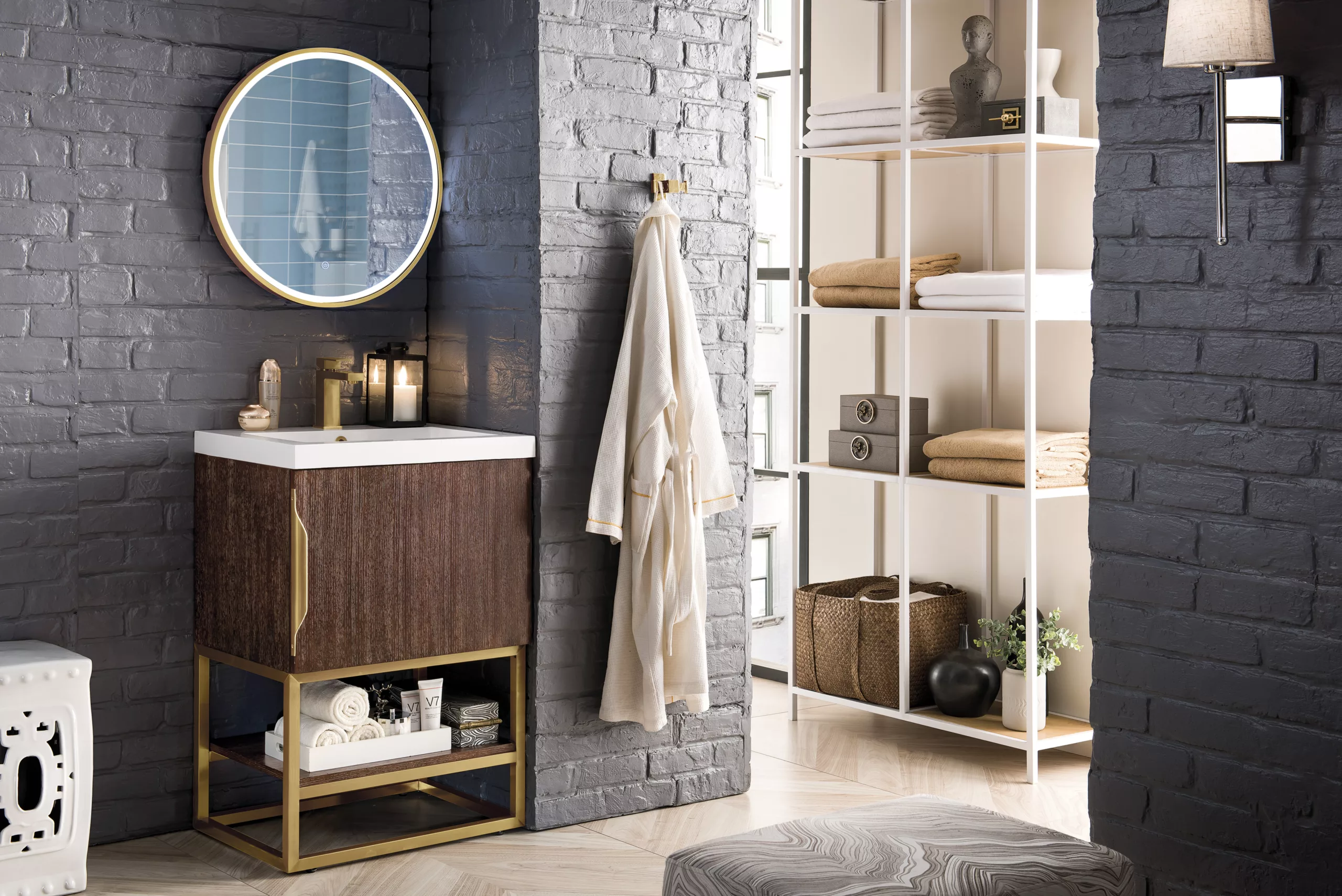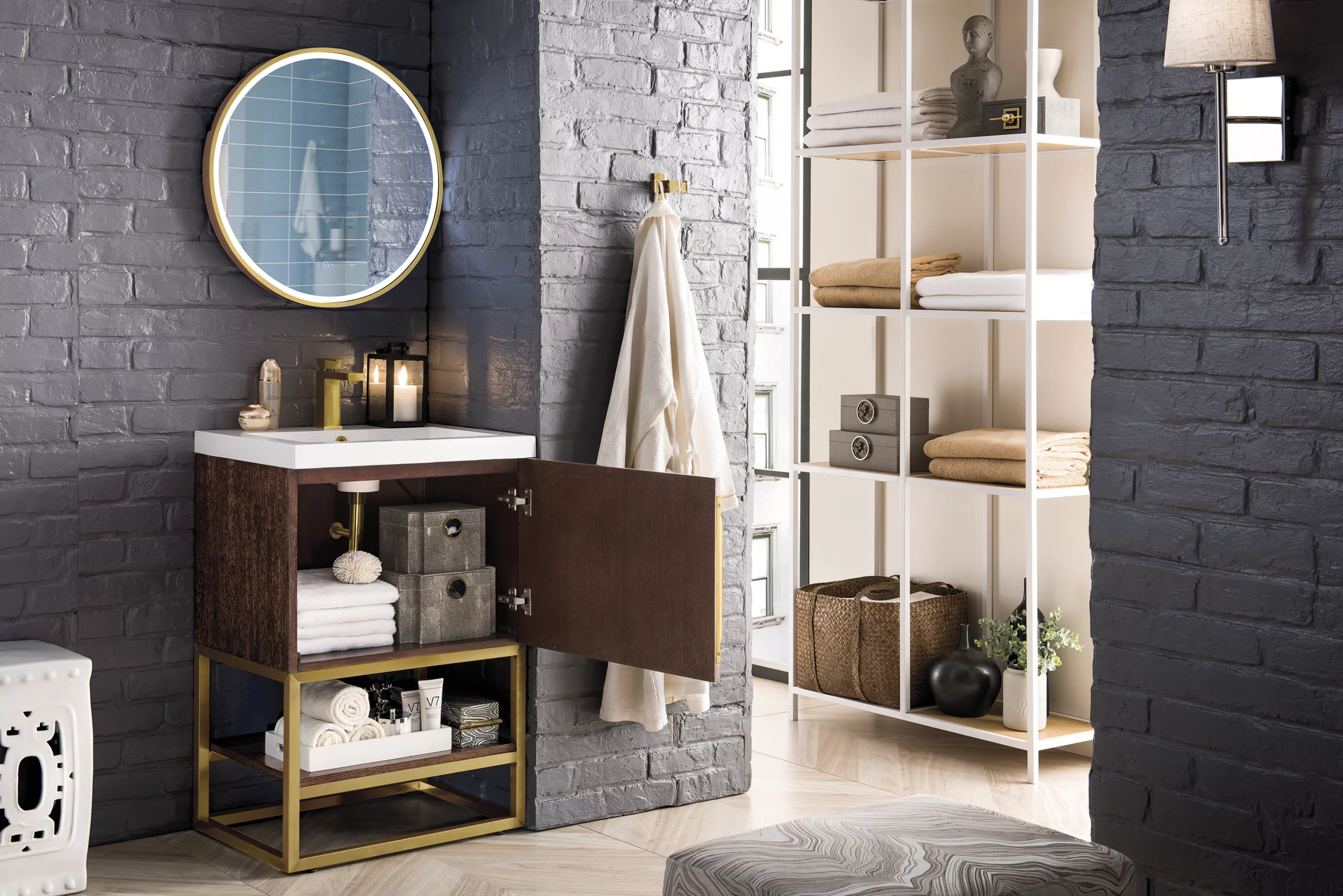 Be the first to add a fresh, contemporary touch to your bathroom with the elegant 24″ Columbia Single Vanity by James Martin Vanities. Includes one soft-closing cabinet door in a lovely Coffee Oak finish, this stylish bathroom cabinet features clean lines and a simple sculpted base with tons of storage in a Radiant Gold finish. The door opens to an under-sink storage space with one adjustable shelf that will allow you to store your bathroom essentials. The beautiful Radiant Gold hardware is included, giving this cabinet the perfect finishing touch. The cabinet is finished inside and out with a premium undercoat finish for superior moisture and UV resistance. This versatile cabinet includes an integrated White Glossy Composite Stone top that is pre-drilled for your convenience.
