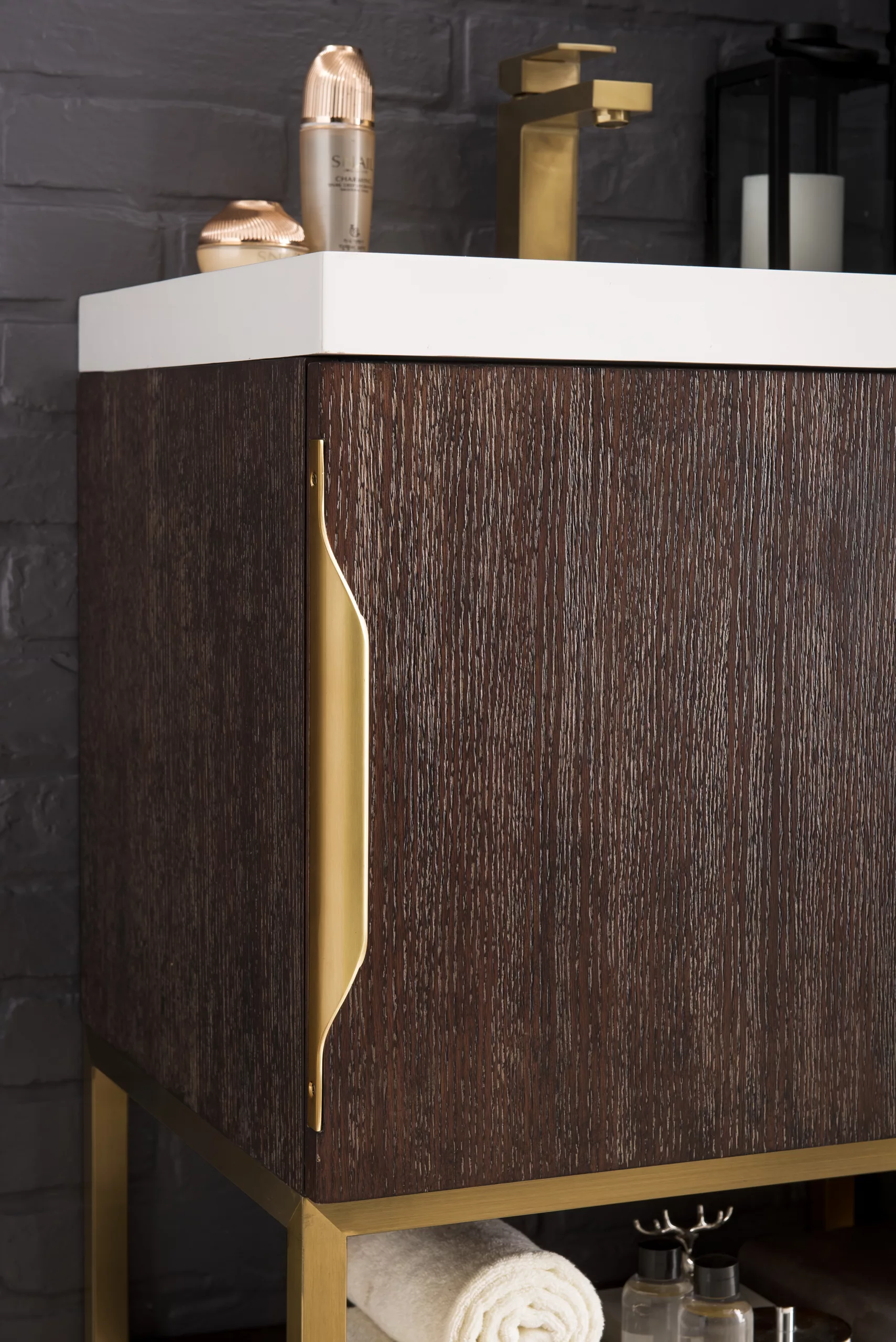 Columbia 24″ Single Vanity, Coffee Oak, Radiant Gold w/ White Glossy Composite Stone Top