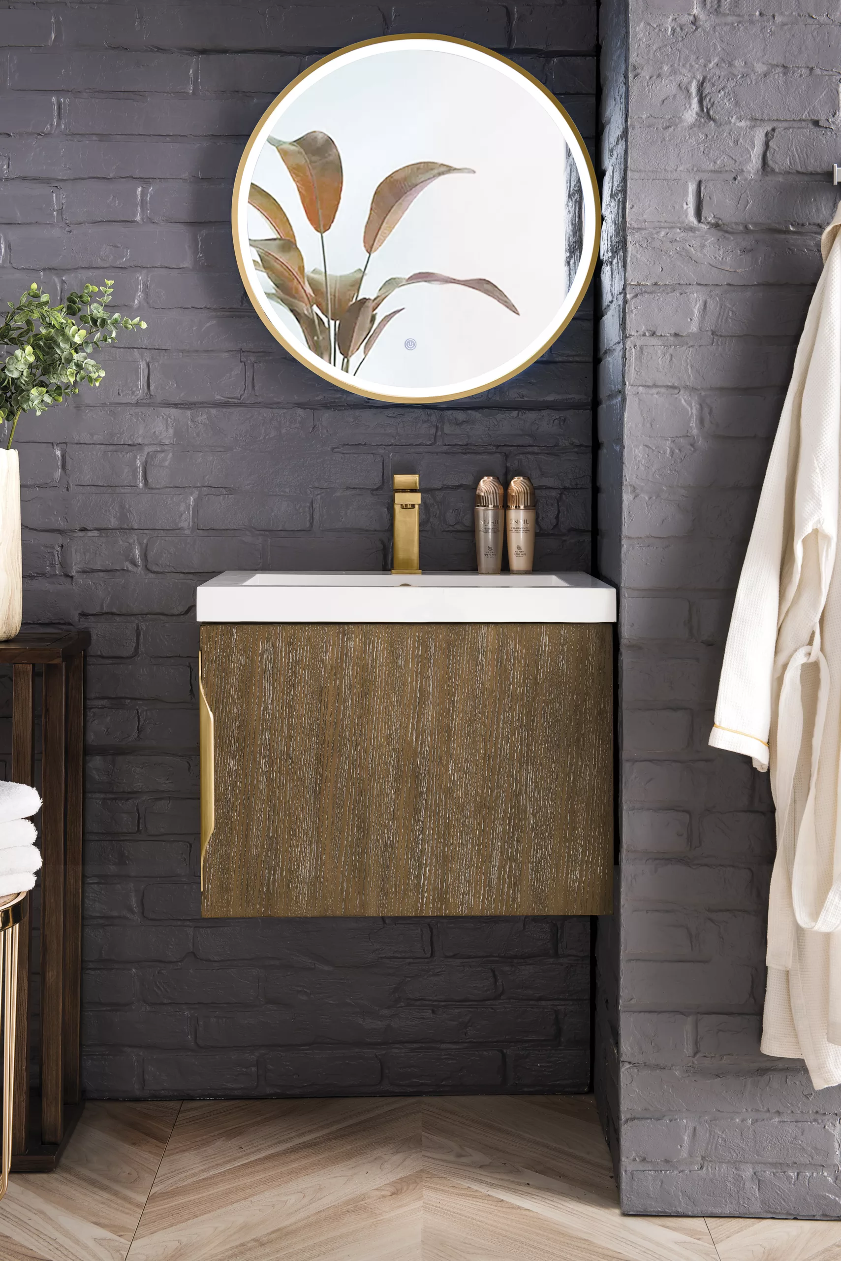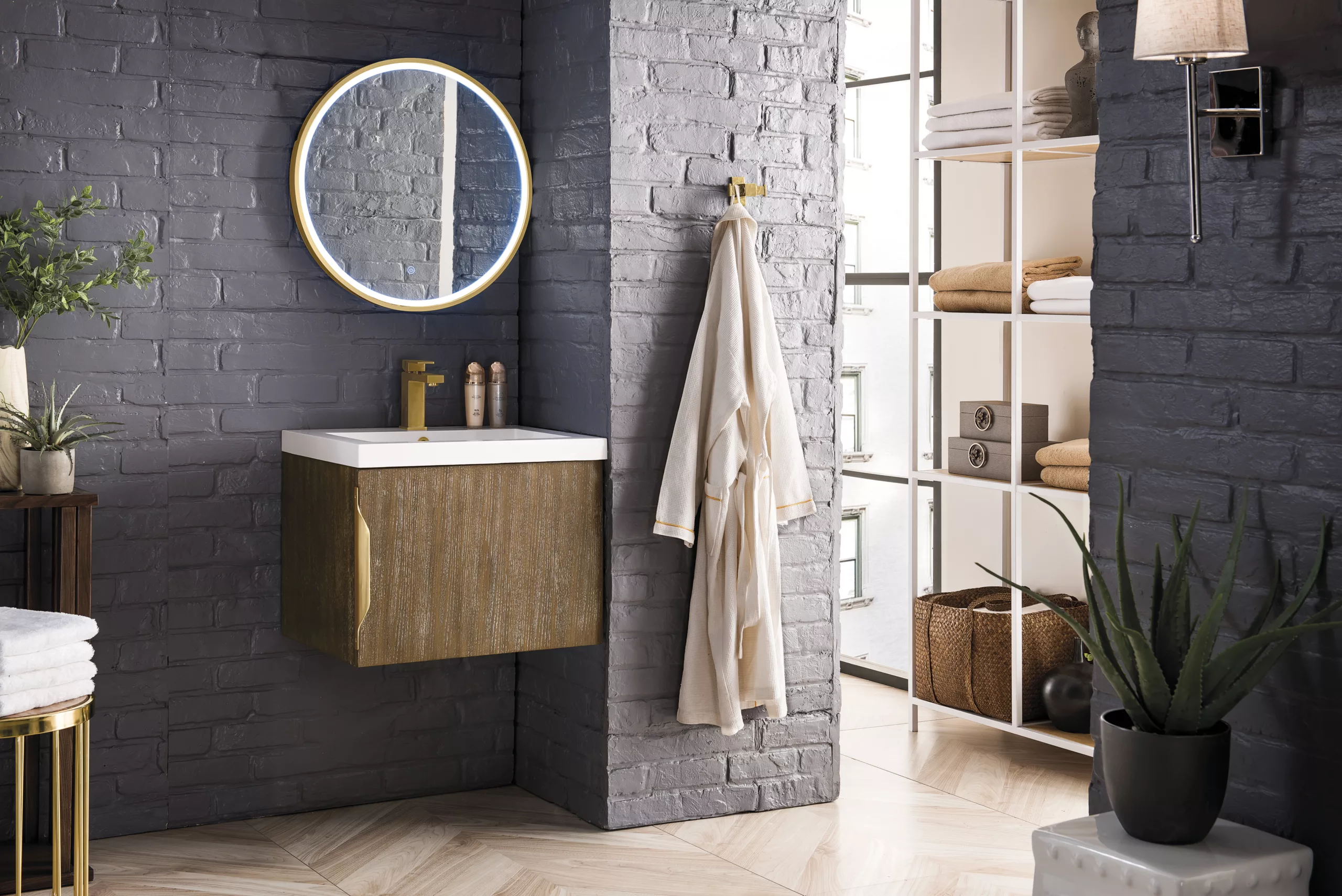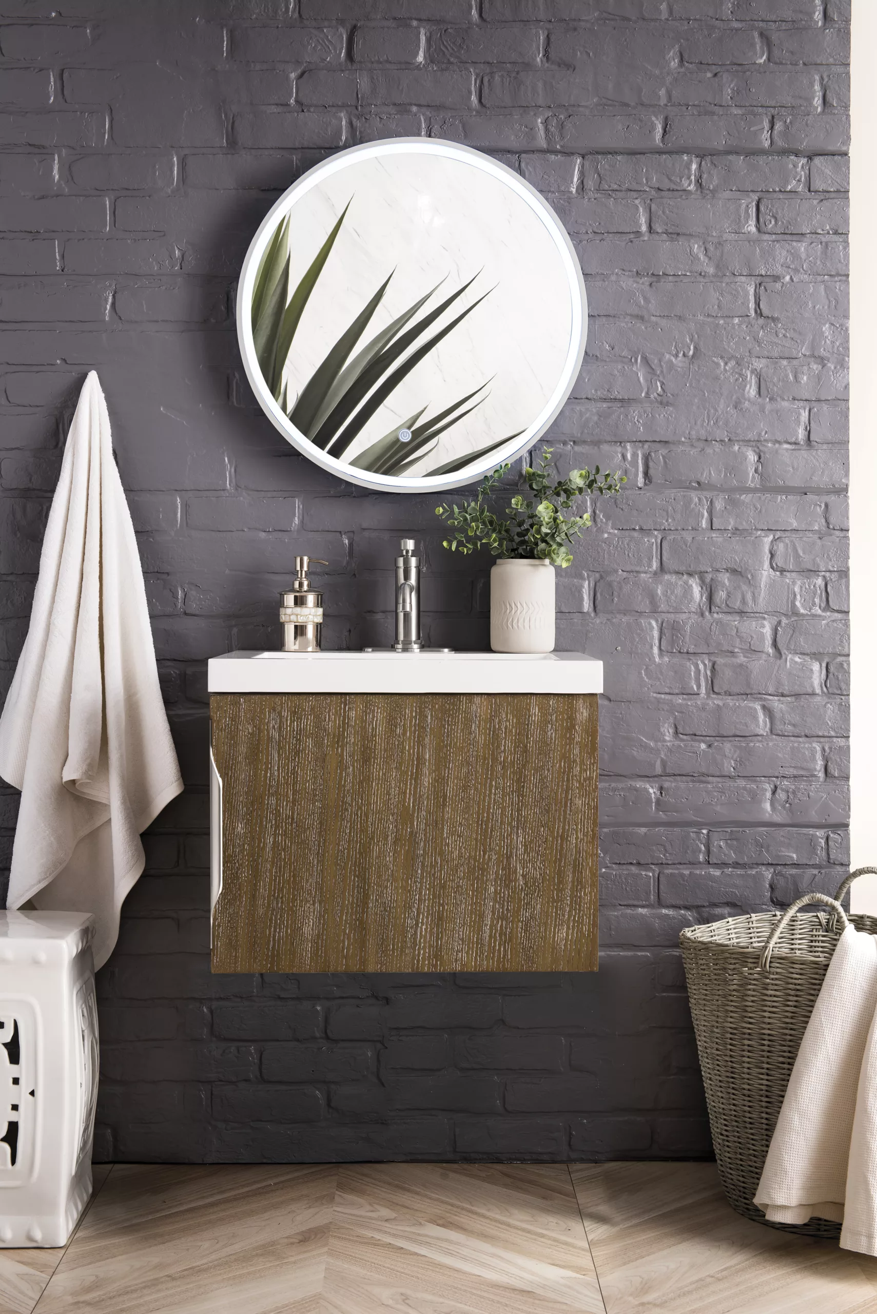 Be the first to add a fresh, contemporary touch to your bathroom with the elegant 24″ Columbia Single Vanity by James Martin Vanities. Includes one soft-closing cabinet door in a lovely Latte Oak look. The door opens to an under-sink storage space with one adjustable shelf that will allow you to store your bathroom essentials. The beautiful Brushed Nickel hardware is included, giving this cabinet the perfect finishing touch. The cabinet is finished inside and out with a premium undercoat finish for superior moisture and UV resistance. This versatile cabinet includes an integrated White Glossy Composite Stone top that is pre-drilled for your convenience.