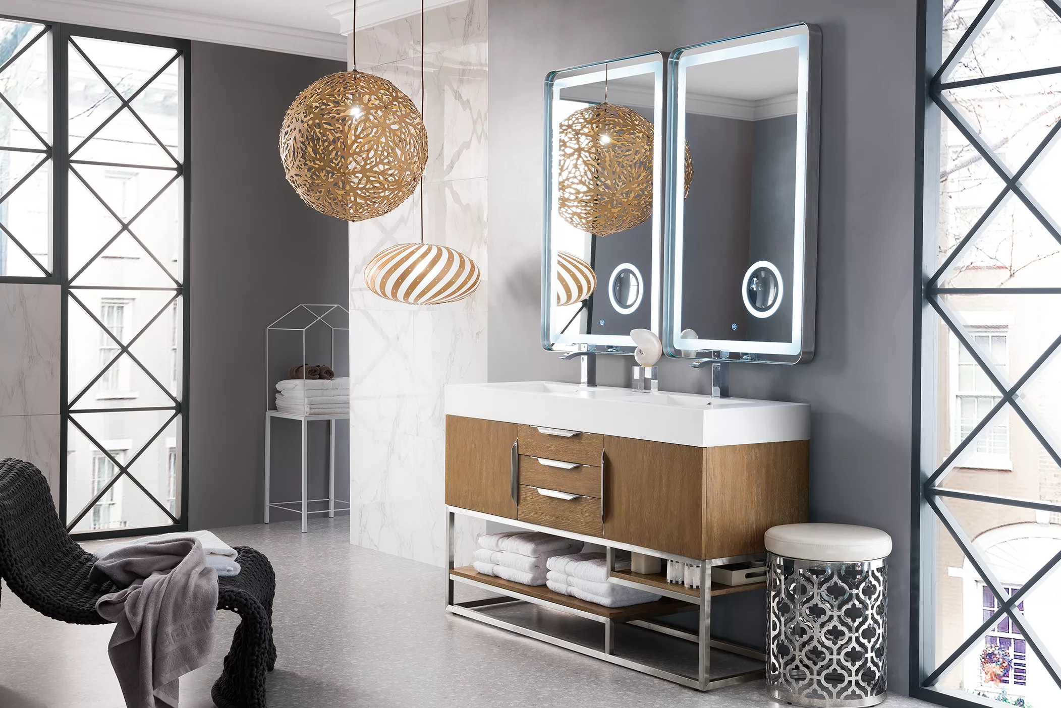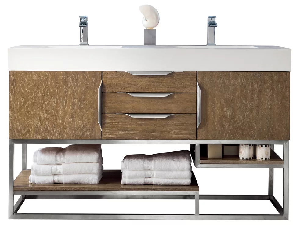 The Columbia 59″ Latte Oak Double Vanity offers maximum storage with two soft-closing doors, three soft-closing drawers, and lower shelf space. This cabinet includes premium features such as one solid bamboo drawer organizer and one 120 Volt UL Rated electrical component with two electrical and two USB outlets. The Brushed Nickel finished base coordinates with the pulls. Glossy White Composite Stone countertop with integrated sink included.