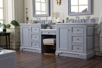 The De Soto 94″ Silver Gray Double Vanity Set by James Martin Vanities features two 36″ cabinets connected by a matching 22″ make-up counter. The cabinet includes one faux shagreen drawer organizer and interior shelf space. This cabinet also includes a decorative wood backsplash. The look is completed with a 3 CM eased edge Arctic Fall Solid Surface top and two white ceramic rectangular sinks.