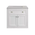 Inspired by today’s modern furnishings, characterized by clean lines juxtaposed with unexpected artisan details, the 36″ Emmeline creates a bold statement. A solid Ash wood base frame supports a faceted front Vanity Cabinet featuring two spacious drawers lined with an aluminum laminate surface. The lightly wire-brushed Ash veneer in a Pebble Oak finish adds authentic drama, allowing this vanity to work into any bath space. The treasured, neutral tones and textures of the Carrara marble vanity top display a white background with delicate grey veining.
