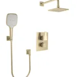The Huntington Brass square style thermostatic shower package boasts a sleek, modern design that includes both a lever handle and a square handle for thermostatic control. This allows for easy coordination with a wide range of bathroom styles and fixtures, making it a versatile choice for any project.