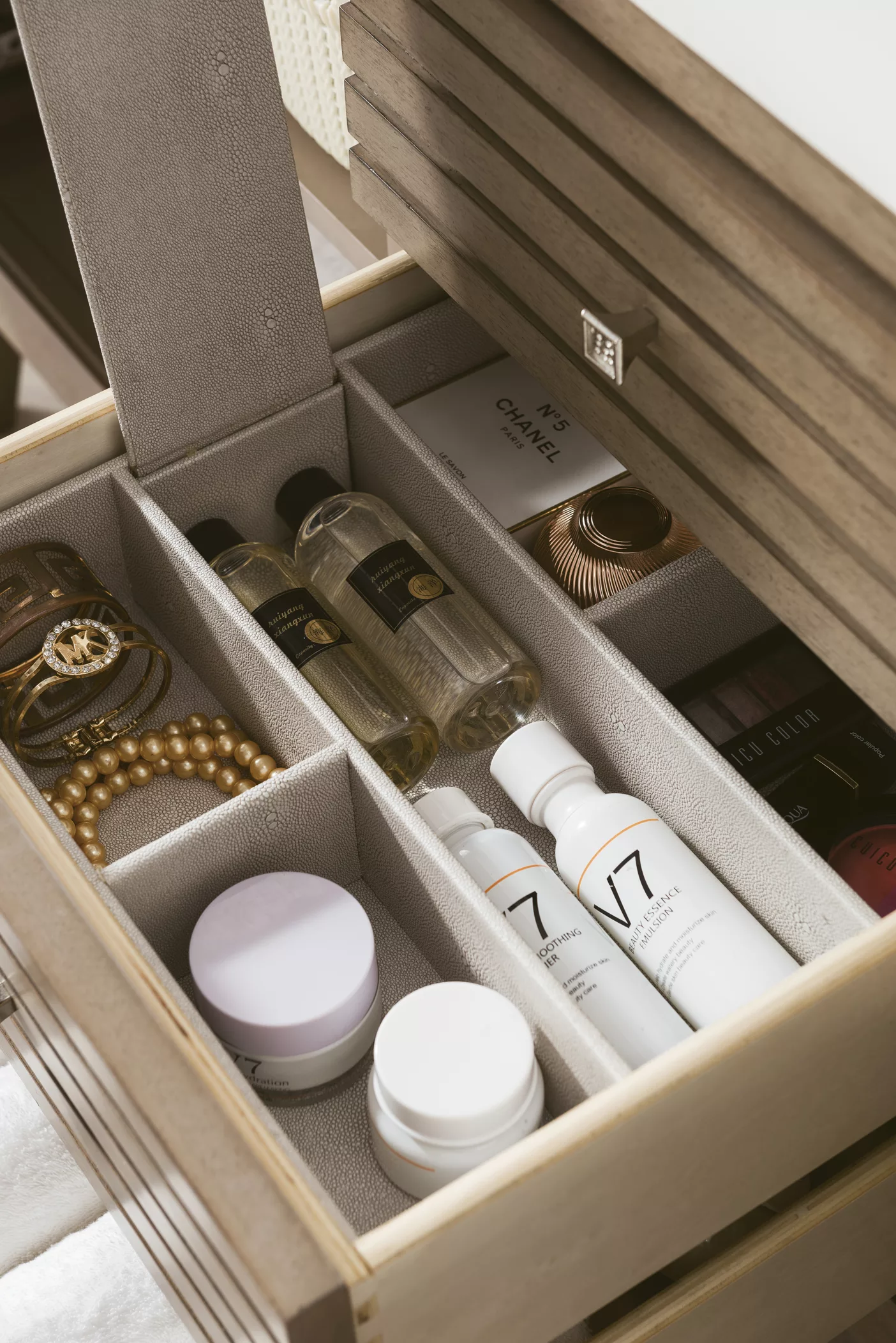 The Linear 59″ Whitewashed Walnut Double Vanity features spacious storage options with two doors, two shelves, and three drawers. Cabinet exterior is made from solid American Walnut, highlighted by clean lines and Satin Nickel finish knobs. Premium features include one faux shagreen drawer organizer and one 120 Volt UL Rated electrical component with two electrical and two USB outlets. The look is completed with a Glossy White Composite Stone integrated top and sink. The recessed interior drawer is designed to only extend and open half way.