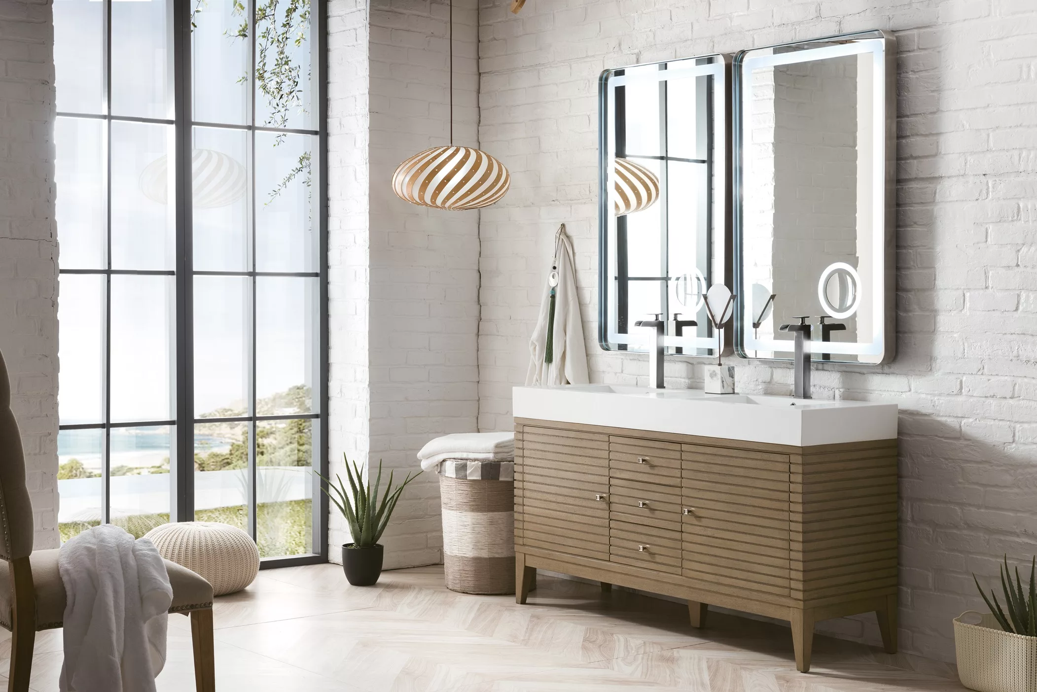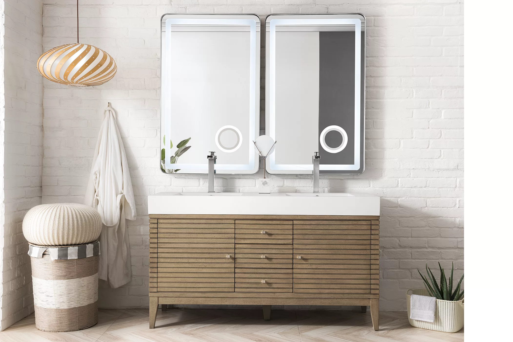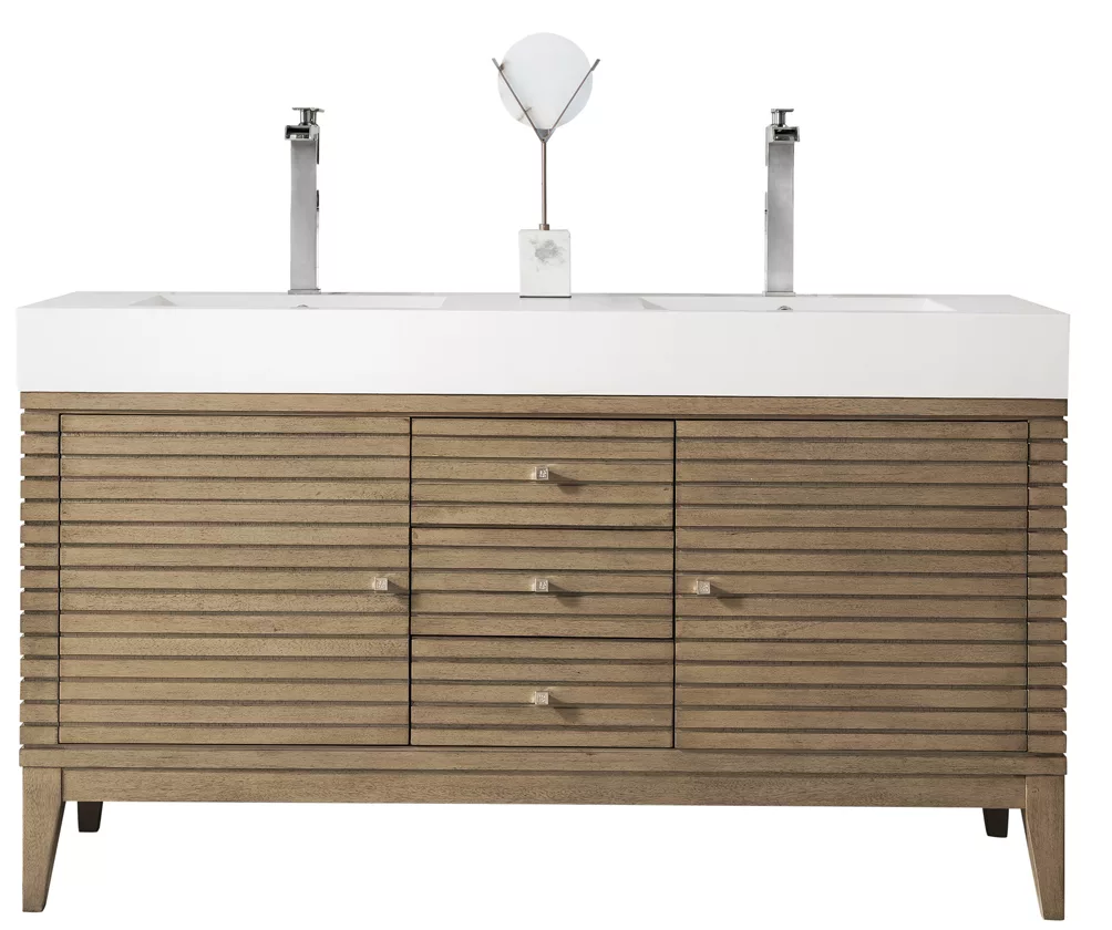 Linear 59″ Double Vanity Whitewashed Walnut w/ Glossy White Composite Stone Top