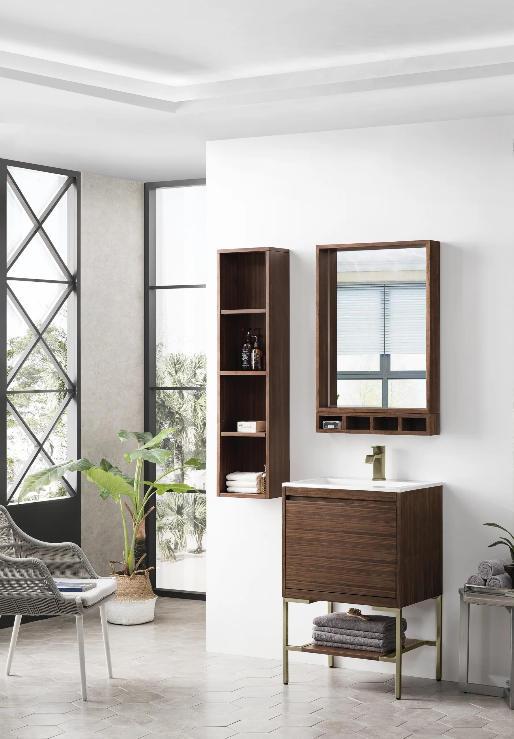 The Mantova 23.6” Mid-Century Walnut Single Vanity by James Martin Vanities will elevate your space by adding a touch of timeless décor to your bathroom. This vanity combines a cutting-edge design with pristine craftmanship to bring your bathroom a clean modern look providing you with both style and functionality. Generous storage features include soft-close drawers with one removable drawer organizer. The look is completed with Champagne Brass finished Stainless Steel Base and a Glossy White Composite Stone integrated top and sink.