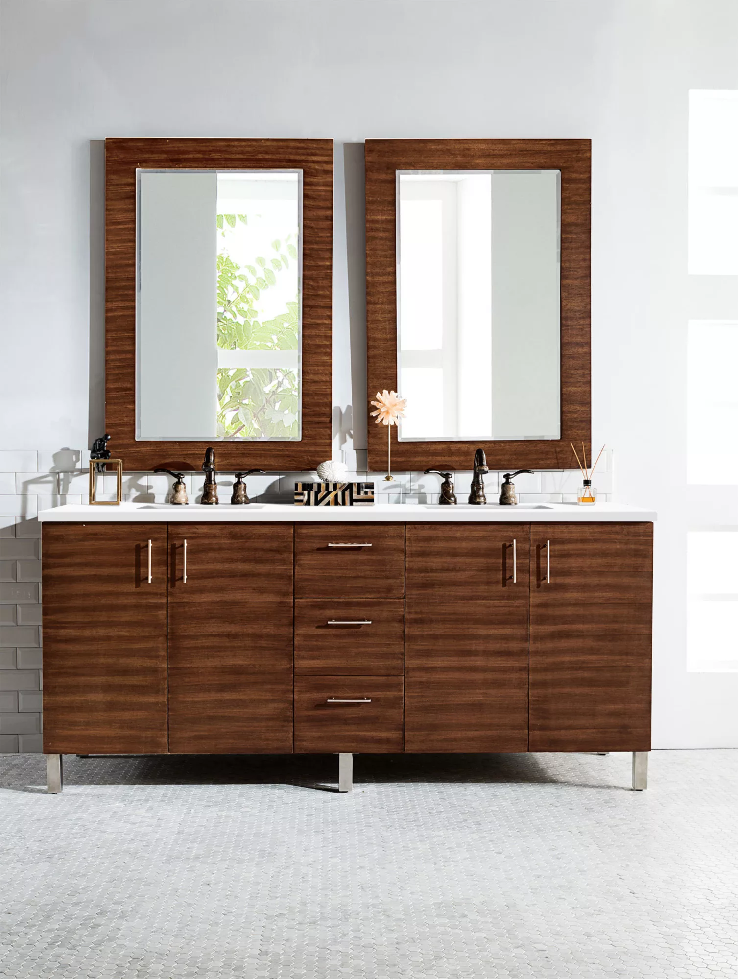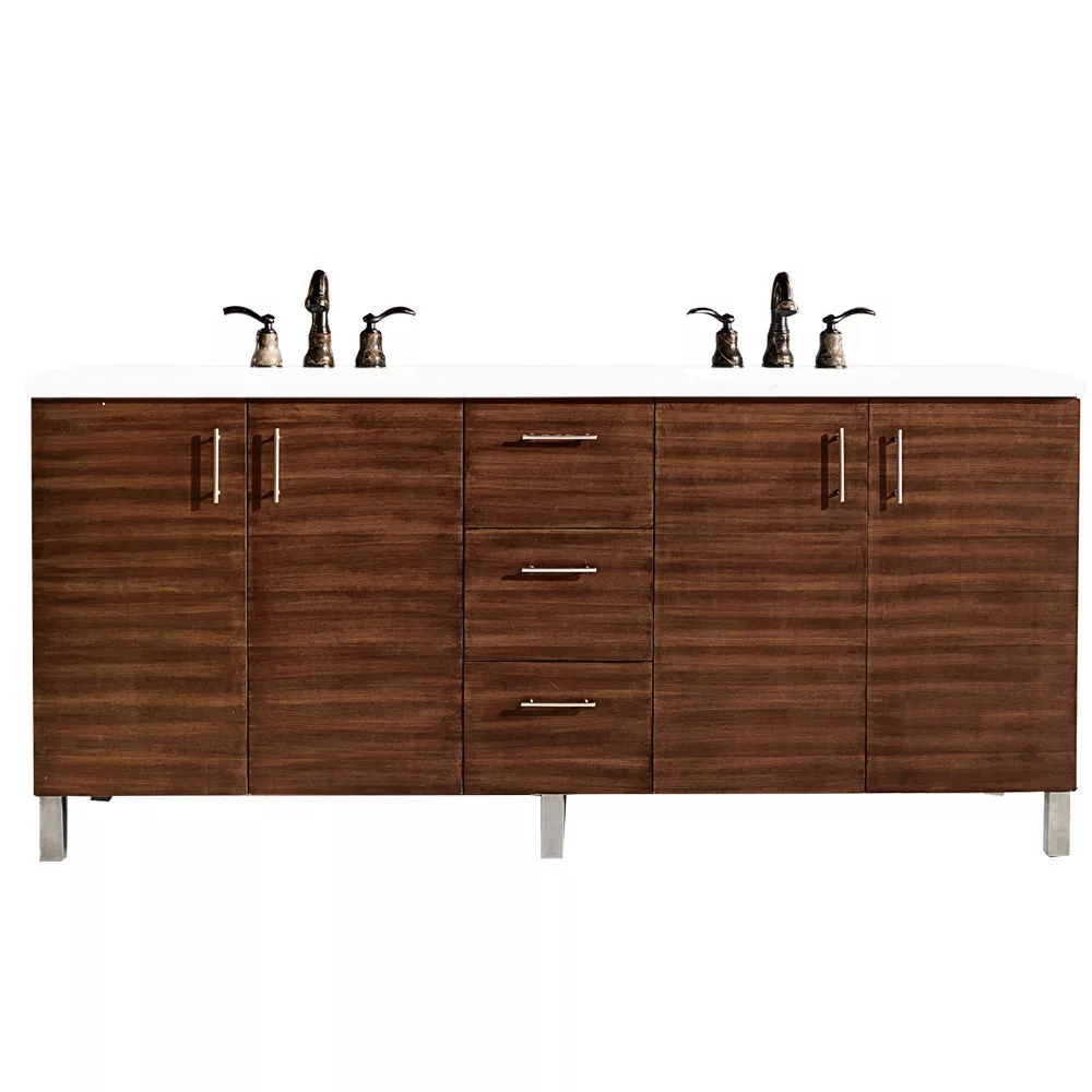 The Metropolitan 72″ American Walnut Double Vanity by James Martin Vanities is a wall-mount optional cabinet with mounting brackets and removable Brushed Nickel legs. This cabinet offers ample storage space and soft-close doors and drawers. The look is completed with a 3 CM eased edge White Zeus Silestone Quartz top and one white ceramic rectangular sink.