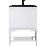 The Milan 23.6” Glossy White Single Vanity Cabinet by James Martin Vanities will elevate your space by adding a touch of timeless décor to your bathroom. This vanity combines a cutting-edge design with pristine craftmanship to bring your bathroom a clean modern look providing you with both style and functionality. Generous storage features include soft-close drawers with one removable drawer organizer. Glossy White hardware/stand is included.