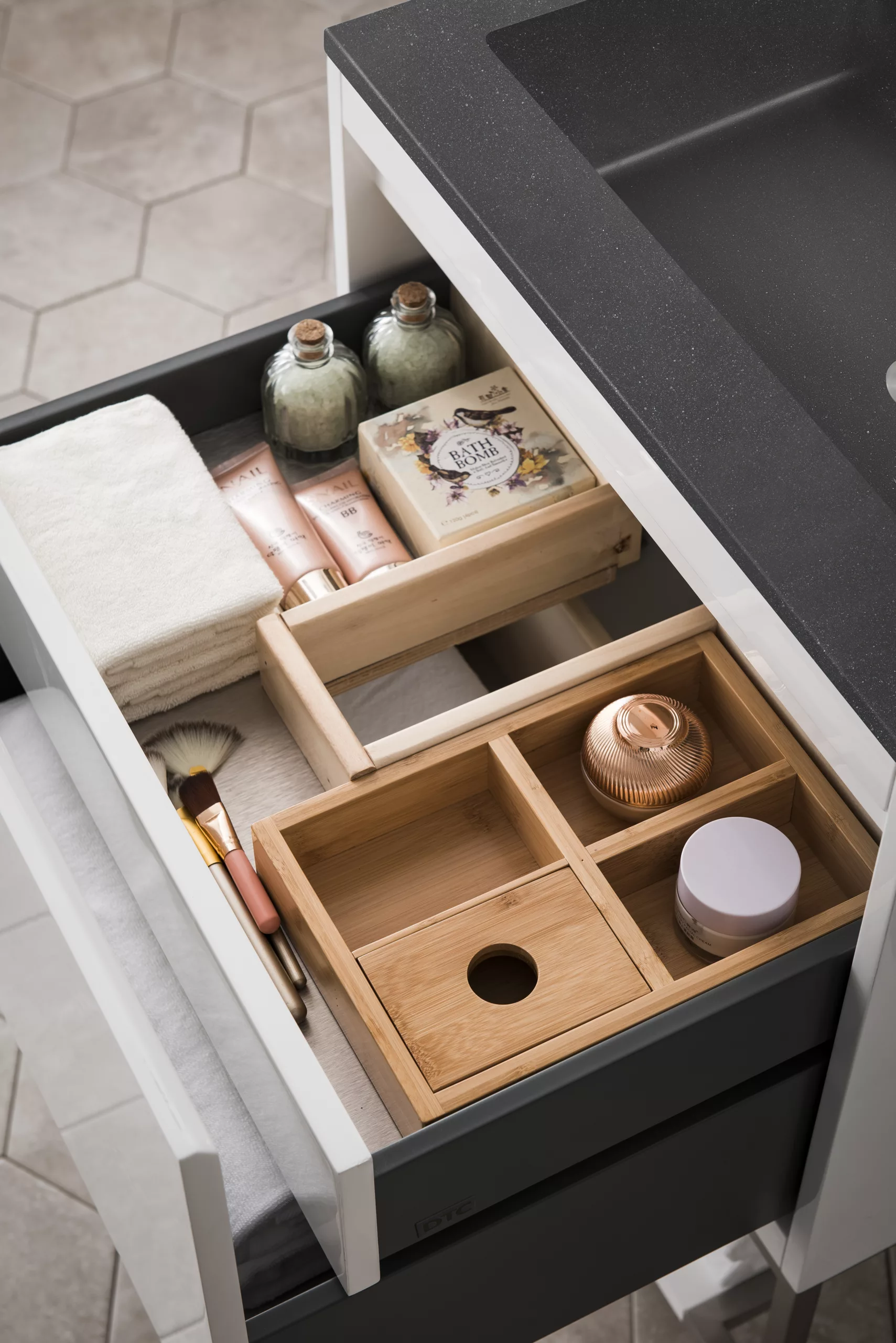 The Milan 23.6” Glossy White Single Vanity by James Martin Vanities will elevate your space by adding a touch of timeless décor to your bathroom. This vanity combines a cutting-edge design with pristine craftmanship to bring your bathroom a clean modern look providing you with both style and functionality. Generous storage features include soft-close drawers with one removable drawer organizer. The look is completed with Matte Black hardware/stand and a Charcoal Black Composite Stone integrated top and sink.