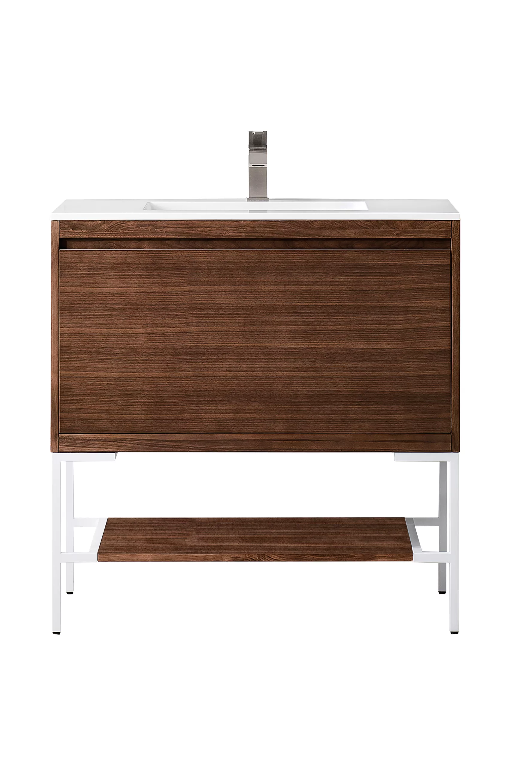 Milan 35.4″ Single Vanity, Mid-Century Walnut, Glossy White w/ Glossy White Composite Stone Top