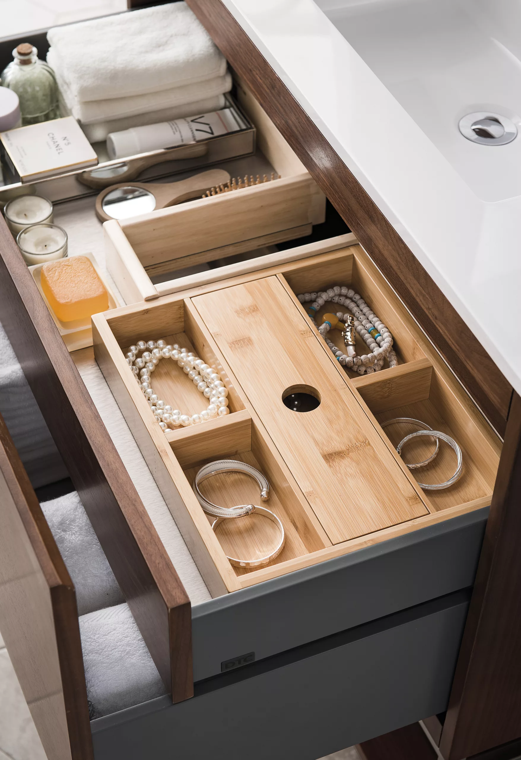 The Milan 35.4” Radiant Gold Single Vanity by James Martin Vanities will elevate your space by adding a touch of timeless décor to your bathroom. This vanity combines a cutting-edge design with pristine craftmanship to bring your bathroom a clean modern look providing you with both style and functionality. Generous storage features include soft-close drawers with one removable drawer organizer. The look is completed with Matte Black hardware/stand and a Glossy White Composite Stone integrated top and sink.