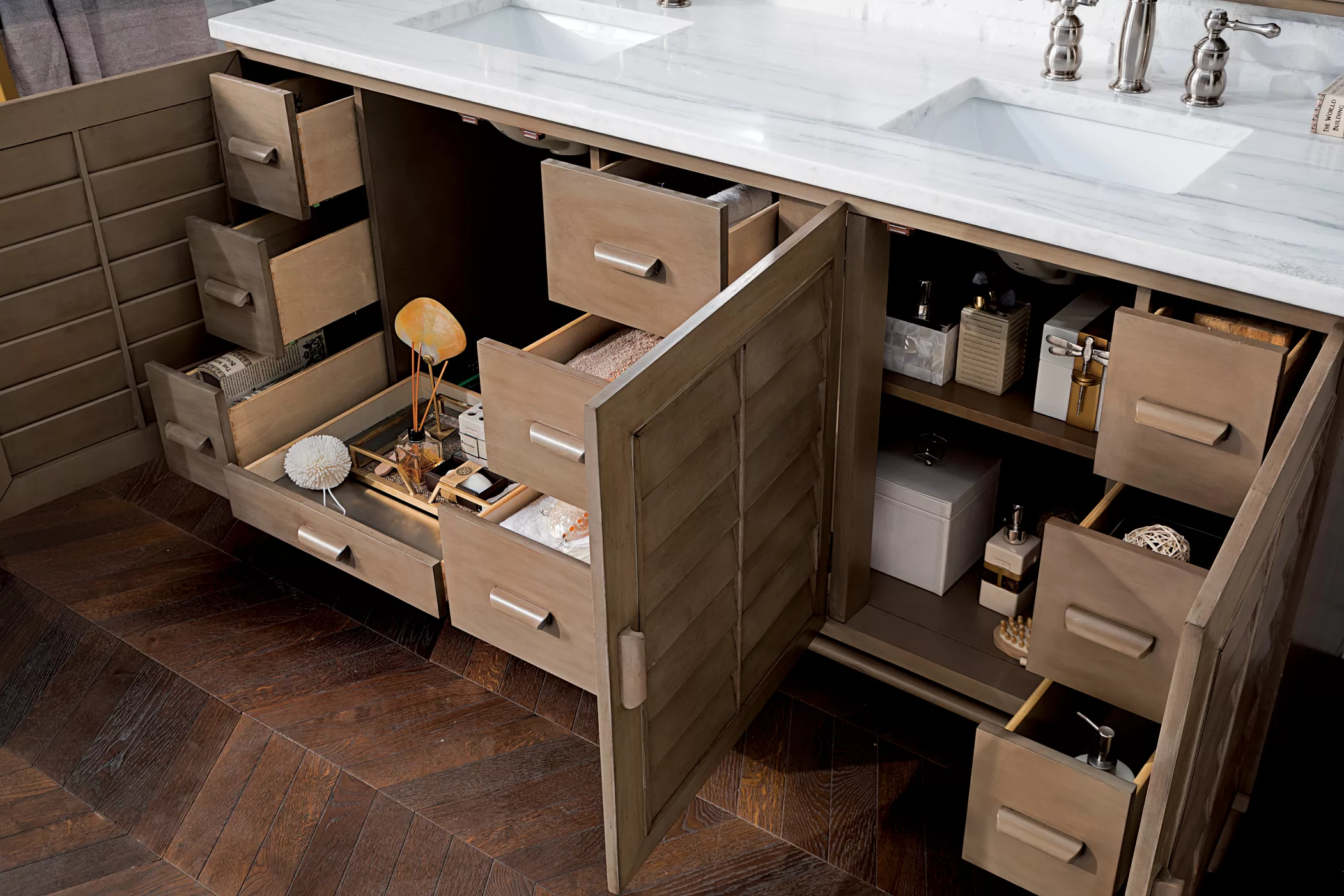 The Portland 72″ Whitewashed Walnut Single Vanity features soft-close hinges on doors, with undermount soft-close slides on drawers and concealed ample storage. A proportionate and complementary design with wood knobs and brushed aluminum interior drawers. The look is completed with a 3 CM eased edge Arctic Fall Solid Surface top and two white ceramic rectangular sinls.