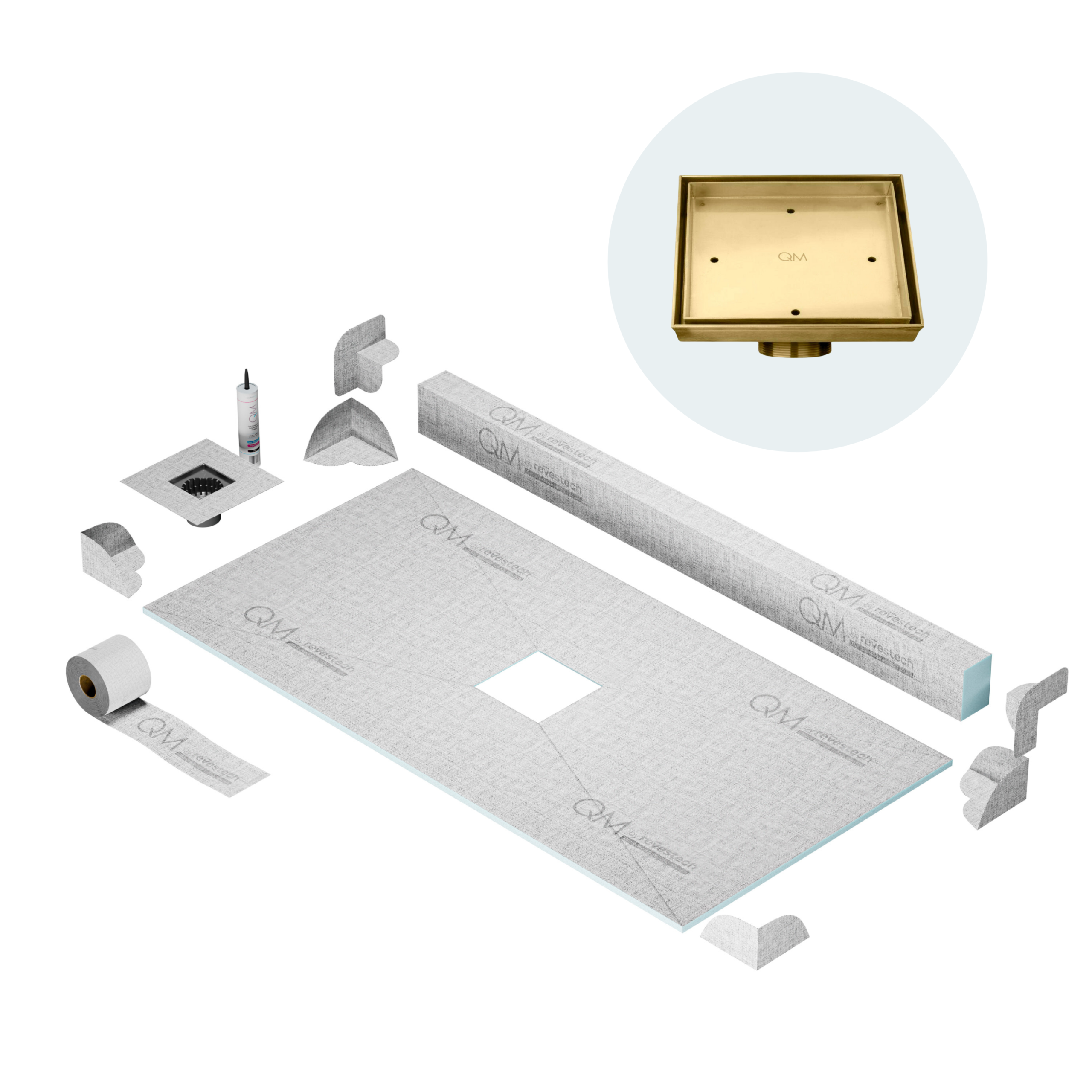 QM Center Shower Pan Kit 32″ x 63″ with 4″ Mist (Tile-In) Square Drain in Gold