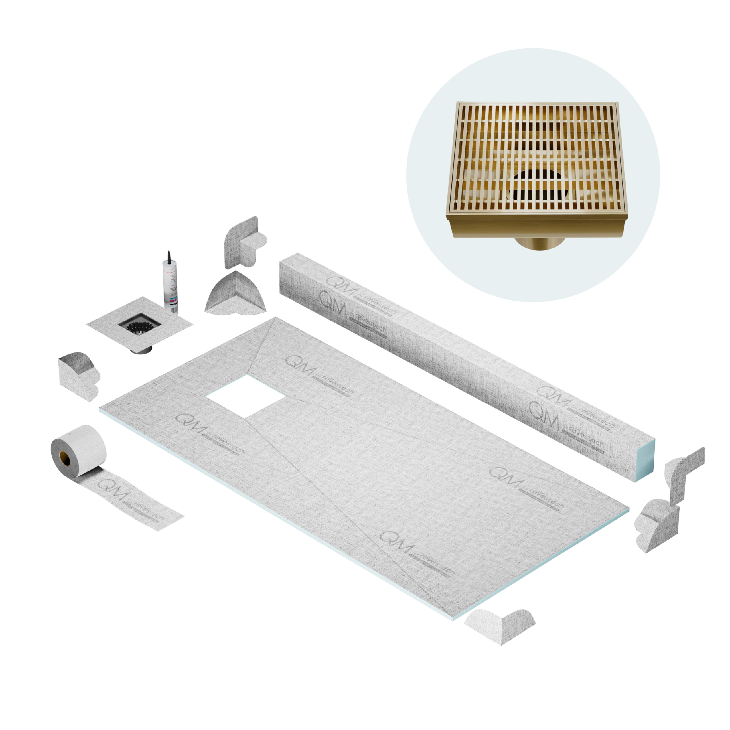 QM Curbless Off-Center Shower Pan Kit 32″ x 63″ with 4″ Wedgewire Square Drain in Gold