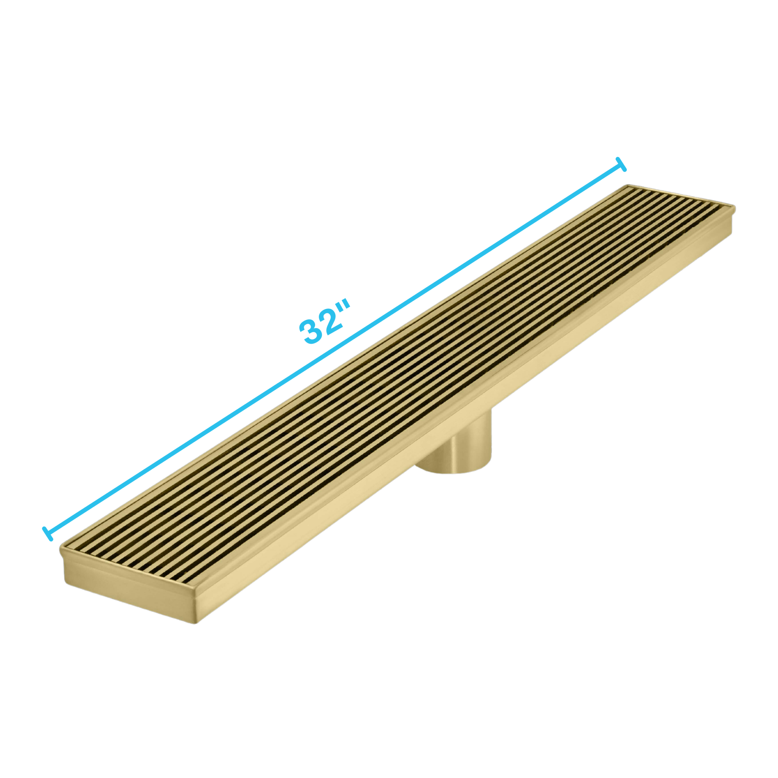 QM Delmar Series. 32″ Standard length Plain Edge linear drain. Wedgewire Line. Gold