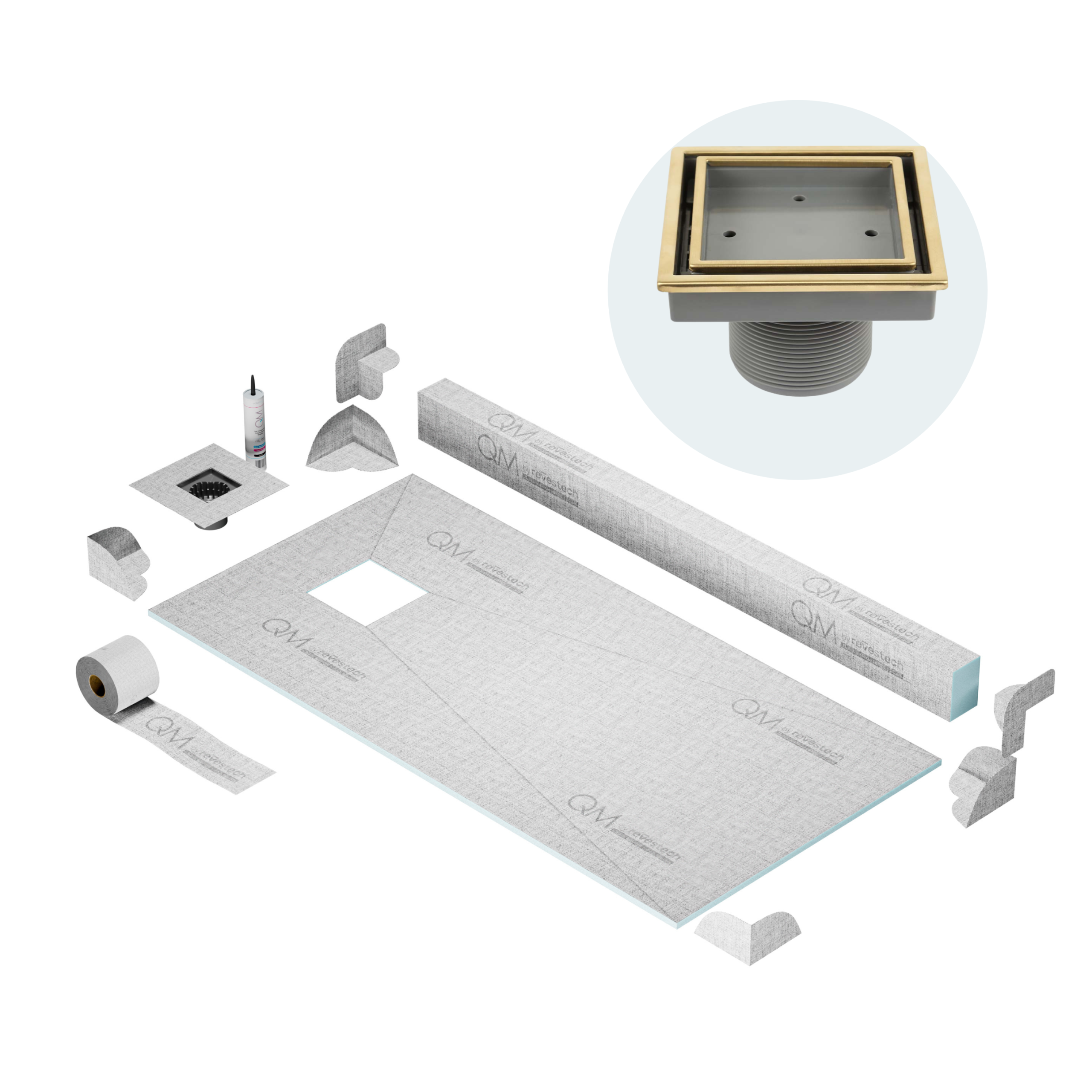 QM Off-Center Shower Pan Kit 32″ x 63″ with 4″Veil (Tile-In) Square Drain in Gold