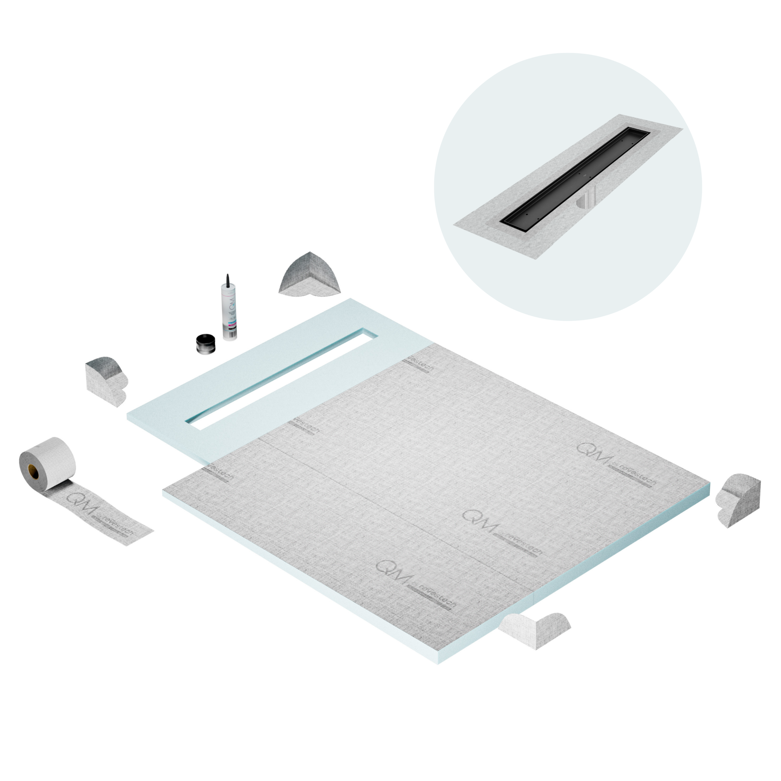 QM Shower Pan Curbless Kit 40″ with a 32″ Mist (Tile-in) Linear Drain Flange Edge in Black