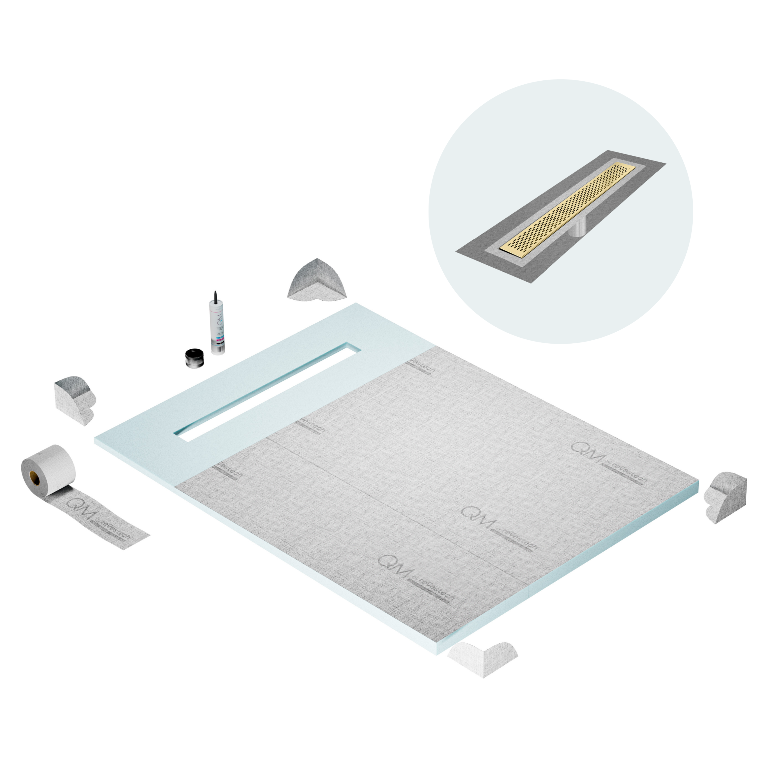 QM Shower Pan Curbless Kit 48″ with a 36″ Delta Linear Drain Flange Edge in Gold