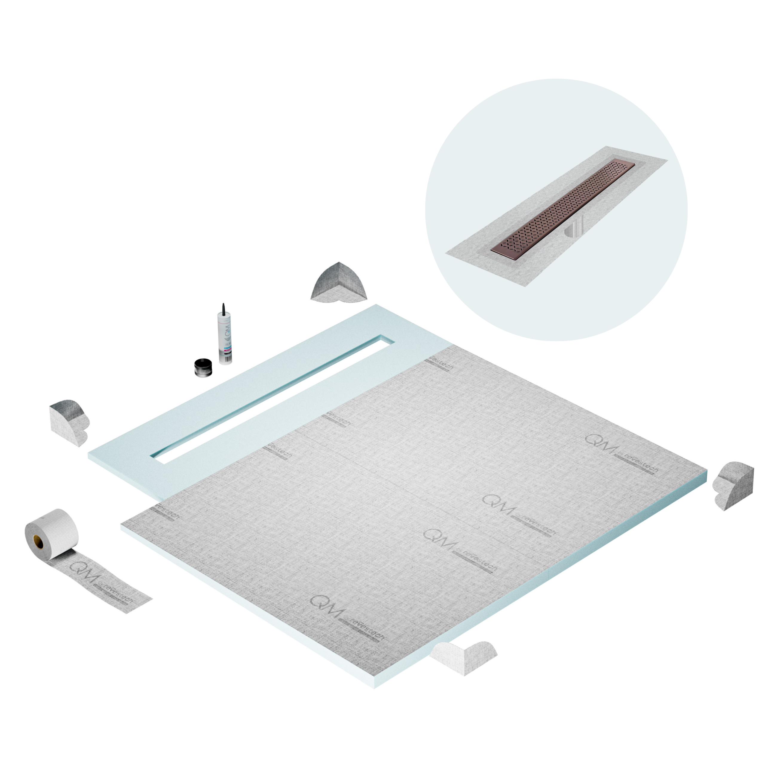 QM Shower Pan Curbless Kit 56″ with a 48″ Lotus Linear Drain Flange Edge in Bronze