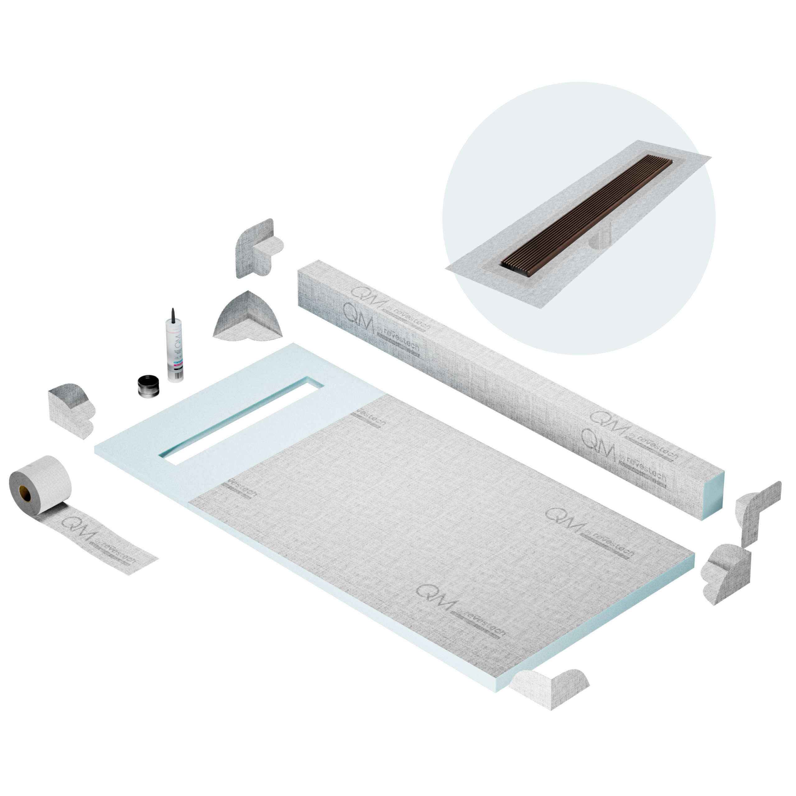 QM Shower Pan Kit 32″ with a 24″ Wedgewire Linear Drain Flange Edge in Bronze