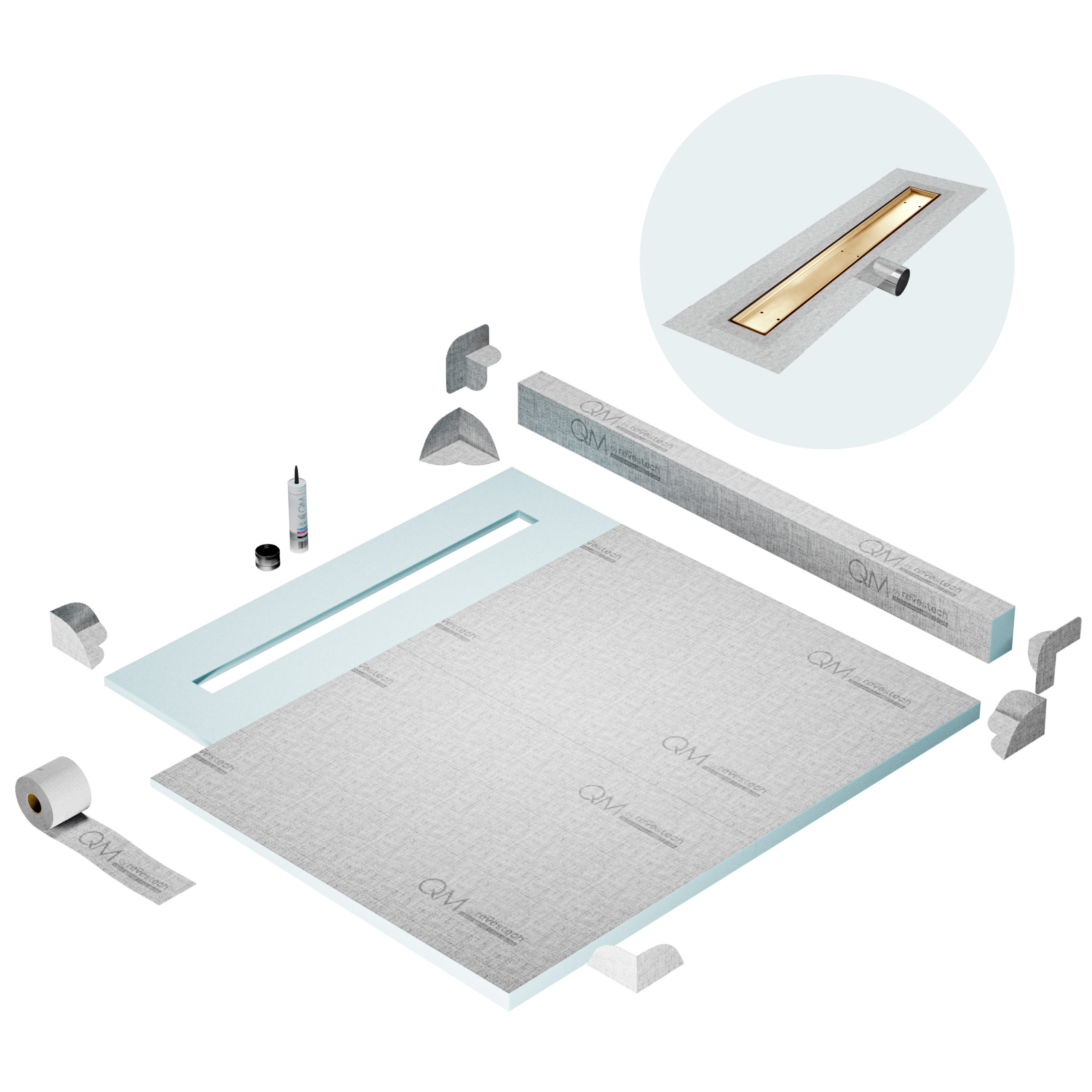 QM Shower Pan Kit 56″ with a 48″ Mist (Tile-in) Linear Drain Flange Edge Side Outlet in Gold