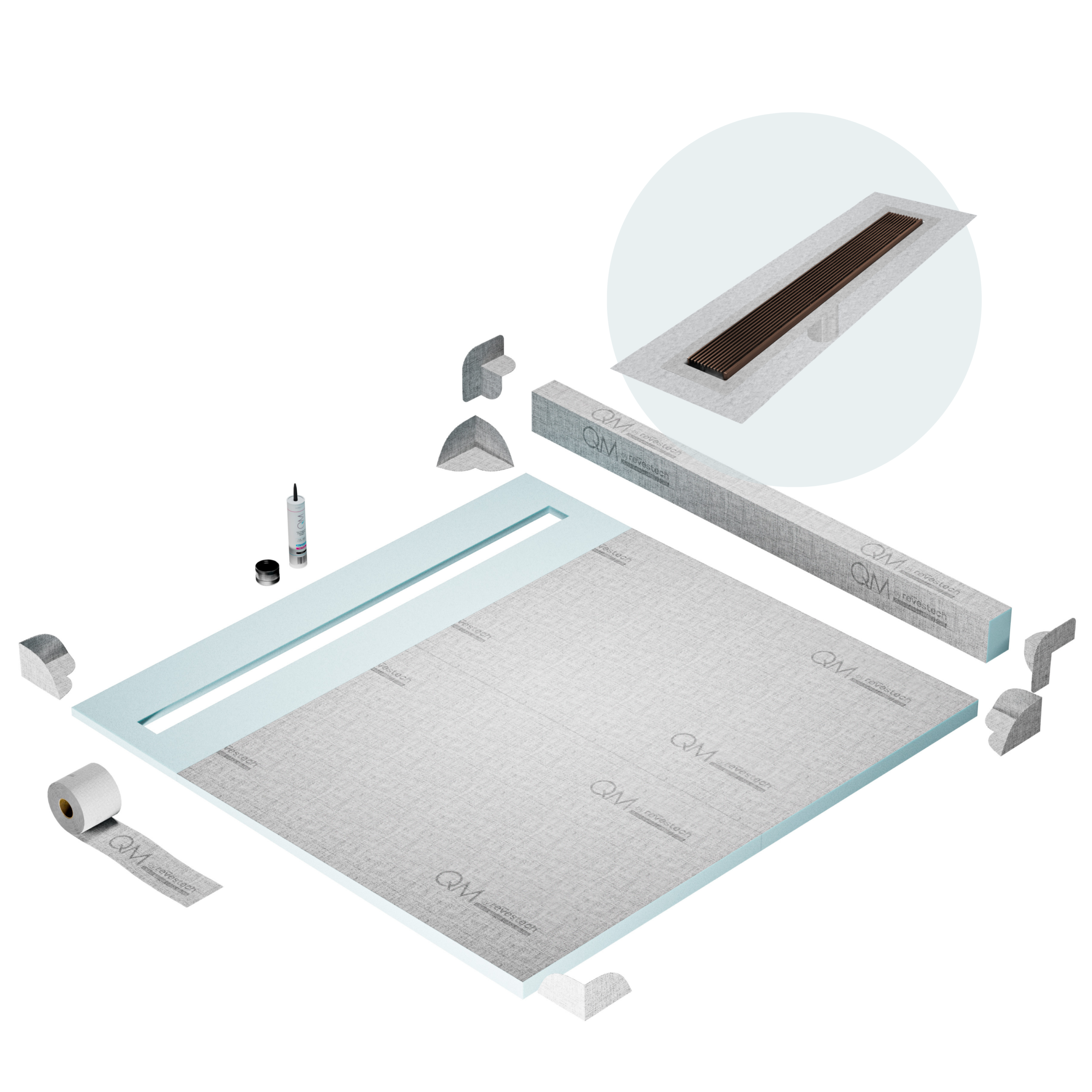 QM Shower Pan Kit 64″ with a 58″ Wedgewire Linear Drain Flange Edge in Bronze