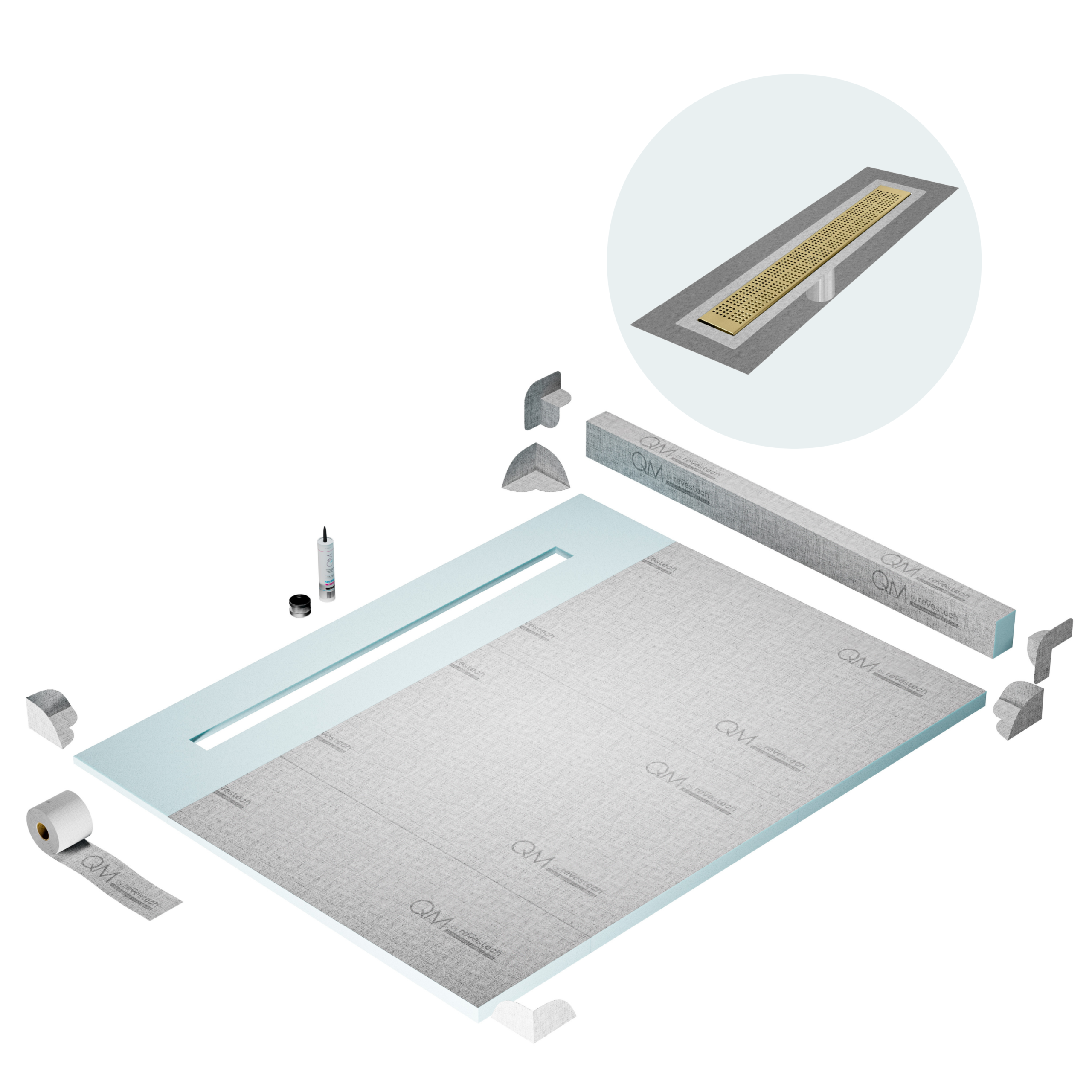 QM Shower Pan Kit 80″ with a 58″ Kai Linear Drain Flange Edge in Gold