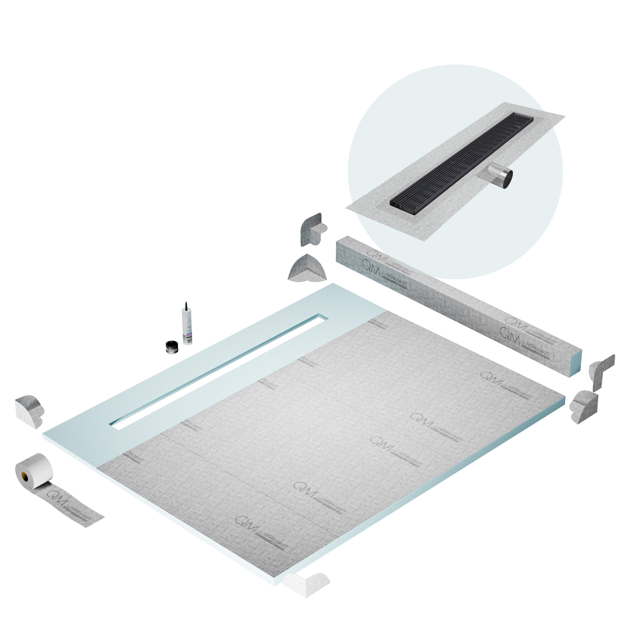 Flexible membrane for waterproofing shower trays, walls, and floors. Our membrane is 100% waterproof and solves humidity problems in other less reliable applications, such as rubber paint or waterproof cement. Additionally, it is anti-bacterial and antimould, favoring completely dry environments to avoid the proliferation of microorganisms.