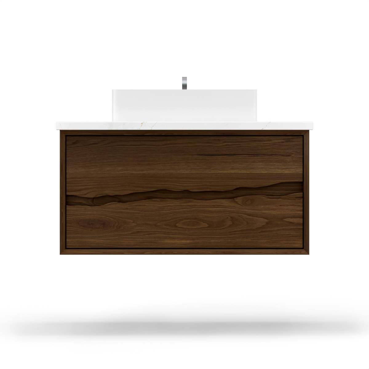 The Ventura collection embodies the perfect fusion of natural elegance and contemporary design. This single floating vanity, made from stained wood, features a striking live edge where the top and bottom drawers meet. Designed in two heights, 21″ and 18″, with the latter crafted specifically for Vessel sinks. It is paired with a standard quartz countertop, available in 4 sizes and 2 stains.