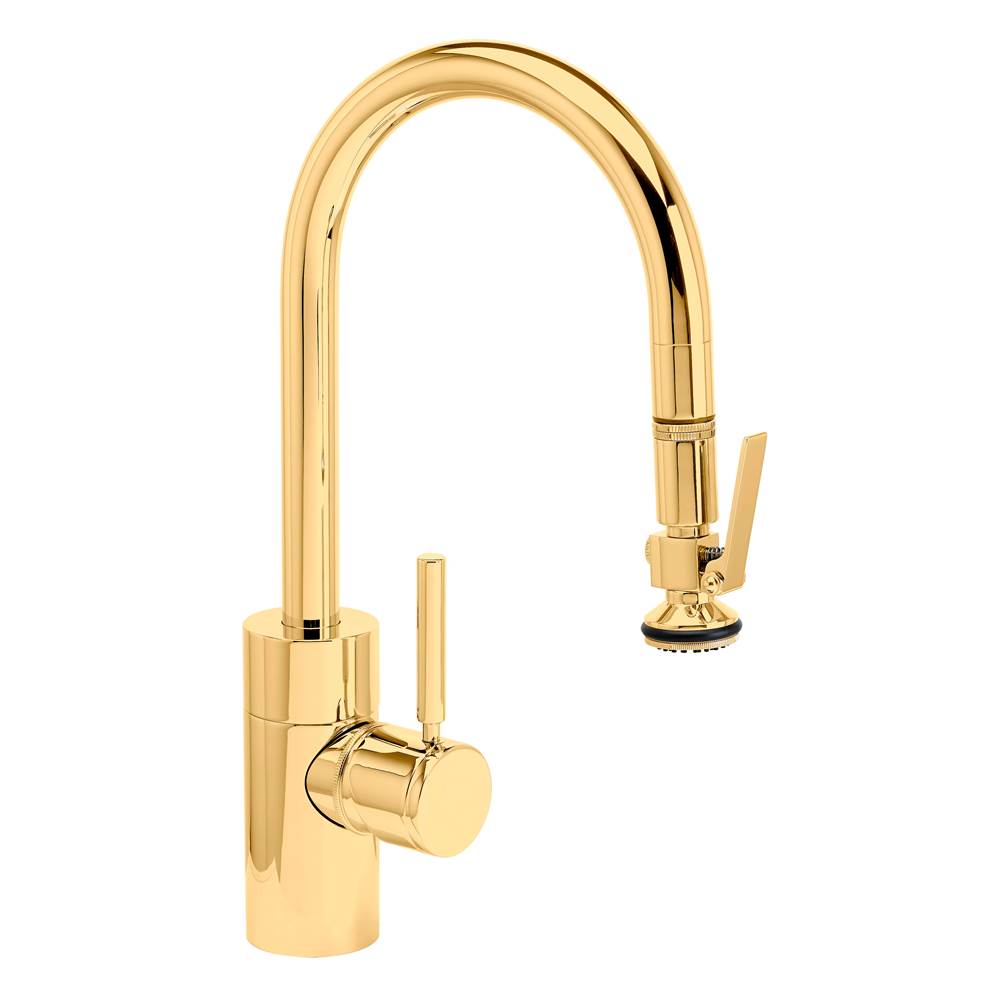 A smaller version of Waterstone’s transitional Pulldown faucet that’s perfect for kitchen islands or smaller sinks. The Prep Size PLP Pulldown Faucet’s innovative design adds a professional-level functionality when cooking or cleaning at home. A brilliant design that accents today’s kitchen trends of simplicity and function. Home chefs and foodies will love how Prep Pulldown makes food prep and clean up are easy. Our unique PLP (Positive Lock Pulldown) sprayer extends 18” from spout and can be used to reach every corner of the sink. A flexible braided hose moves with you while the counterbalanced weight prevents the tug-back most Pulldown Faucet users experience. Toggle handle then easily slides back up and ”locks” into place. This innovative PLP design holds the ergonomic handle in place and prevents sag when not in use. Water control handle adjusts up to 22.5 degrees, right or left, for clearance from backsplash. Add matching faucet accessories in both style and finish. Soap/lotion dispensers, air switches or dishwasher air gaps create a professional collection of kitchen faucets for the prep sink area. Made from solid eco-friendly brass or stainless steel. Available in 32 finishes and 316 stainless steel.